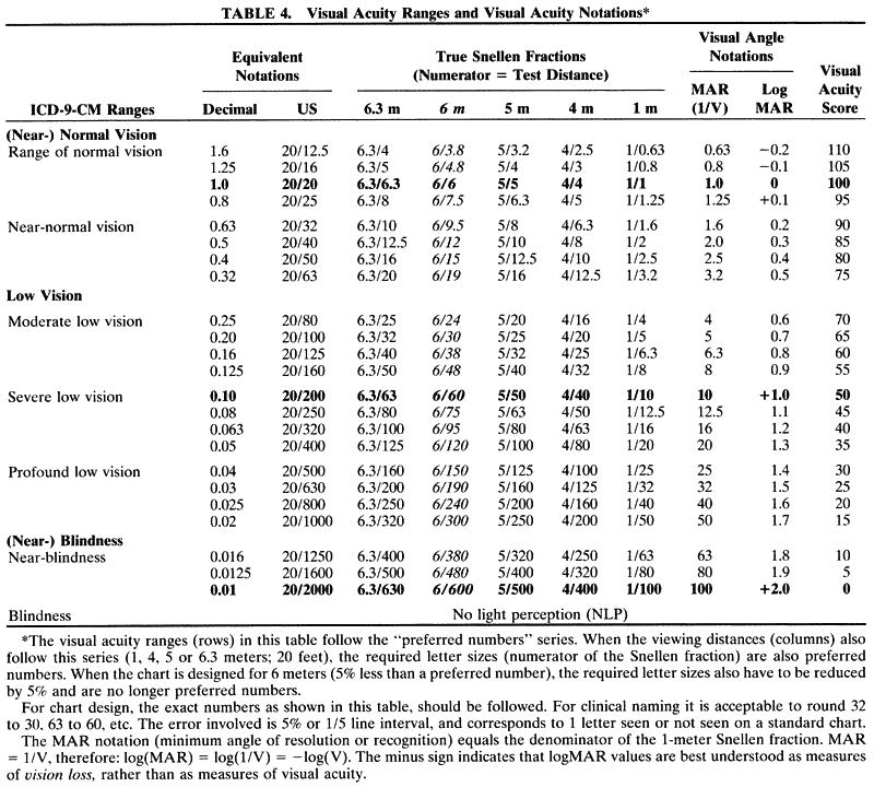 Visual Acuity Score In Table 3, the set of ICD-9-CM visual acuity ranges was compared with a set of reading ability ranges. We found a good fit. The VAS, discussed under visual acuity notations, fits equally well with the visual acuity ranges as with the General Ability Scale quoted above. We may conclude that the VAS (Table 7) provides a reasonable statistical estimate of the generic ability to perform tasks requiring detail vision.