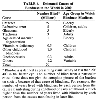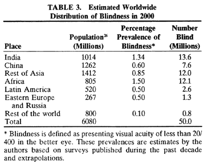 in the developed countries.21–23 However, blindness is still a significant public health problem in most developing countries. Because of poverty and inadequate community health measures, blindness due to trachoma and vitamin A deficiency is still prevalent in many parts of Africa and Asia.15,16,28,32,59 In addition, most of Africa has few ophthalmologists or other adequately trained professionals to provide the basic refractive services and cataract surgery.1,60 Many Asian countries also have a serious deficiency in the availability of eyecare providers, although not as extreme as in Africa. For example, it is estimated that in the year 2000, Africa had fewer than one ophthalmologist for every 500,000 population, and Asia had one for every 200,000 population.1 India has one ophthalmologist for every 100,000 people, but most are based in urban areas, which have less than 30% of the country's population. The number of personnel available for providing refractive services is estimated as one for 250,000 population in the developing world.1 Because of this deficiency of eyecare providers and the lack of adequate infrastructure, the easily treatable blindness due to cataract and refractive error is high in many developing countries.13–16,20,39 The estimated worldwide distribution and the causes of blindness are listed in Tables 3 and 4.