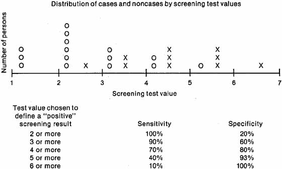 Sensitivity and specificity should always be evaluated together. A test with high sensitivity will detect most of the cases and will thus have few false-negative results. However, if the same test has low specificity, many false-positive results will occur and lead to overreferrals. In contrast, a test with low sensitivity and high specificity will have many false-negative results but few false-positive results. Ideally, a test should have high sensitivity and high specificity, but this goal is difficult to achieve in practice. Because the test results of diseased and nondiseased persons usually overlap, some cases have low (negative) test values and some noncases have high (positive) values (see Fig. 2). The specific test value chosen as a cutoff to define a “positive” screening result will affect both the sensitivity and the specificity. If a low cutoff value is chosen, the sensitivity will be high, because most cases will have “positive” screening results and will be referred for further diagnostic examinations. The specificity, however, will be low because many noncases will also be referred. Increasing the test value chosen as “positive” to trigger referral will increase the specificity, at the expense of the sensi-tivity. The decision to select a specific test value to determine referral depends on the disease being detected. If the failure to detect cases has serious consequences, for example, nondetection of malignant disease, a low test value should be chosen for referral, thus increasing sensitivity even though the specificity will decrease. If an excessive number of overreferrals is unacceptable, for example, when follow-up of screening requires invasive procedures, a high screening test value should be chosen for referral to increase specificity, although the sensitivity will decrease.