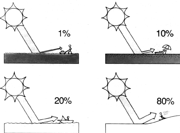 PHYSICAL DEFINITION OF UVR The spectrum of nonionizing radiation ranges from short-wavelength UVR (wavelength 100 nm) to far-infrared radiation (1 mm or 100,000 nm) (Fig. 1). The visible spectrum lies between 400 nm (indigo) to 760 nm (red). Beyond the visible spectrum is infrared radiation, and below the visible spectrum are the shorter wavelengths of nonionizing radiation called ultraviolet radiation (UVR). Although UVR is only 5% of the sun's energy, it is the most hazardous portion encountered by humans. The physical spectrum of UVR ranges from 100 to 400 nm. However, much of the nonionizing radiation is absorbed by the earth's atmosphere. Wavelengths less than 290 nm are totally absorbed by the ozone layer in the stratosphere, and longer wavelengths are absorbed to a lesser extent. Thus, in nature, UVR less than 290 nm does not reach the earth's surface and is not encountered.6 Based on the biologic effects of the different wavelengths or bands, UVR has been subdivided into three bands: UV-A (400 to 320 nm), UV-B (320 to 290 nm), and UV-C (290 to 100 nm).7 UV-A, or near UVR, produces tanning (the browning of the skin due to an increase in the skin content of melanin) and photosensitivity reactions. UV-A is emitted by so-called black lights, which are often used to make objects fluoresce and are also used in tanning salons. UV-B causes sunburn (painful erythema and blistering), and increased exposure to UV-B is associated with an increased rate of skin cancer.6–9 UV-C, which is germicidal and may also cause skin cancer, is not normally encountered on the earth's surface and comes entirely from artificial sources such as germicidal ultraviolet lamps or arc welding. ENVIRONMENTAL, TEMPORAL, AND GEOGRAPHIC VARIATIONS IN ULTRAVIOLET RADIATION UVR is scattered across the whole sky by the Rayleigh effect, just as blue light is scattered.8 Light or broken clouds do not significantly reduce the level of UVR, although levels are reduced by heavy cloud cover.8 A sky with a clear horizon for 360° provides for maximal exposure; when hills, trees, or buildings obstruct part or all of the horizon, the UVR exposure is reduced proportionally.10 UVR can also be reflected by the ground, the amount dependent greatly on the type of surface (Fig. 2). Grass and soil reflect only 1% to 5% of UV-B, water 3% to 13%, sand and concrete about 7% to 18%, and fresh snow up to 88%.10 As the sun makes its daily transit, the spectral content of sunlight changes substantially (Fig. 3). At low incident angles, nearly all visible and ultraviolet energy is reflected or absorbed by the atmosphere, giving the familiar reddish hue to early morning and late evening sunlight. The UV-A and UV-B content of sunlight increases as the sun reaches its zenith and progressively decreases during the afternoon. Similarly, the farther from the equator, the more oblique is the angle of sunlight incidence and the lower the UVR level on the ground. Many people have learned the hard way that an hour's exposure to tropical sunlight imparts a far greater dose of UV-B than does an hour on the beach in New England or the Pacific Northwest. As the Earth tilts to produce changing seasons, so too does the angle of sunlight incidence and the resulting UVR content of sunlight, with summer sunlight imparting far greater doses of UV-B than sunlight of other seasons. The ambient dose of UVR also increases somewhat at higher altitudes, because there is less atmosphere to filter the sun's energy. UV-B exposure increases approximately 20% per 10,000 feet. Climbers have frequently discovered that they are vulnerable to sunburn even when the sun seems to exert little warming effect. Persons climbing and skiing on snow-covered peaks are at particular risk because of the extremely high ultraviolet reflectivity of snow and ice. The eyes are normally protected and shielded from UVR by a number of factors11,12aand only receive a small fraction of ambient UV-B under normal circumstances. The normal horizontal alignment of the eyes and the orbits significantly reduces ocular exposure to whole-sky irradiation. Further anatomical protection is provided by the brows, the nose, and the cheeks.13 The eyelids provide protection that is further enhanced by squinting, a common reflex in bright sunlight. The eyes are relatively unprotected laterally, although the transmission of UVR by internal reflection in the cornea may lead to a concentration of ultraviolet irradiation at the nasal limbus.14 Other personal factors that can decrease ocular UVR exposure in a given environment include wearing a hat and protective eyeglasses.11,12 Taken together, these different factors result in an ocular exposure that is between 7% and 17% less than the ambient UVR level.12 OCULAR TRANSMISSION OF ULTRAVIOLET RADIATION Only a fraction of the UVR entering the eyes reaches the retina-a fact with important photobiologic implications (Fig. 4). The amount of radiation that is absorbed determines the potential for damage to the absorbing tissue. Energy from the dissipation of the absorbed radiation results in tissue damage. Radiation that is not absorbed by a superficial tissue will be transmitted and can affect deeper tissues. The cornea absorbs almost 100% of UV-C radiation (below 290 nm), but transmission rapidly increases for longer wavelengths, so that, for instance, 60% of radiation at 320 nm is transmitted by the cornea.15–18 A normal young human lens absorbs most UVR below 370 nm. As the human lens yellows with age, it absorbs even more UV-A and also shorter blue wavelengths.18,19 In adults, less than 1% of radiation between 320 and 340 nm and only 2% of radiation of 360 nm reaches the retina.20 The lens is exposed to and absorbs most of the UV-B entering the eye. MECHANISMS OF PHOTOTOXICITY The energy carried by a photon is directly proportional to its frequency; thus, the shorter the wavelength, the higher the energy. A photon's energy is absorbed by the atom or molecule with wh