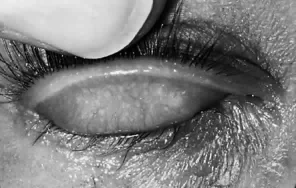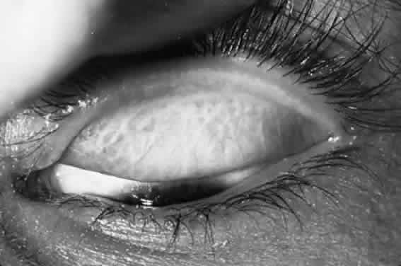 eyelashes produces severe pain and marked photophobia. In the early stages, trachoma presents as a follicular conjunctivitis, with papillary hypertrophy and diffuse inflammatory infiltration involving the whole conjunctiva, including the upper tarsal conjunctiva.1 As trachoma progresses, cicatrization of the conjunctiva appears as fine linear and small stellate scars in mild cases and as broader confluent deep scars in severe cases. In communities with hyperendemic trachoma, children acquire chlamydial eye infection in the first year of life. These young children usually develop a mucopurulent or papillary conjunctivitis without apparent follicle formation. In communities with endemic trachoma, concomitant eye infections with other bacterial and viral agents are common and appear to contribute to the inflammatory intensity of trachoma and to the keratitis.3,32 With active infectious trachoma, there is usually only a minimal to moderate amount of mucopurulent discharge, except during episodes of bacterial conjunctivitis, when the discharge is more abundant. After the first year of life, lymphoid follicles are a regular feature of trachoma (Figs. 1 and 2). These conjunctival lesions are flat or elevated, opaque or clear, have a yellow or gray color, and appear avascular. They vary in diameter from 0.2 to 2.0 mm. The entire conjunctiva is involved by the inflammation but follicle formation in the conjunctiva of the upper tarsus is one of the cardinal signs of trachoma. Follicles may become necrotic, so that they rupture on slight pressure, extruding their contents onto the conjunctival surface. In such cases, the conjunctiva is extremely friable, so small blood vessels rupture on everting the tarsal plate, resulting in hemorrhage into follicles or into the adjacent subepithelial conjunctiva. Not all cases—even those that are severe—develop these large necrotic follicles.