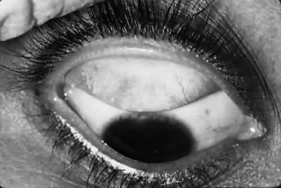 This scar formation also affects the canaliculi and lacrimal duct with obstruction and cutaneous fistula.33 Occlusion of the tear outflow can cause tearing and often leads to the development of dacryocystitis in adult life. Linear scars that form just adjacent to the lid margin are particularly damaging because of the lid distortion that they cause. Cicatricial changes occur throughout the conjunctiva but are most apparent and damaging on the tarsal conjunctiva. One result of extensive scarring is that destruction of goblet cells occurs in severely scarred eyes, with a loss of mucus secretion. The loss of mucus and distortion of the upper lid lead to inadequate surface wetting of the cornea. The drooping or half-closed lids in active trachoma have been attributed to the weight of the lid, to inflammatory involvement of Müller's muscle in the upper lid, and to reflex blepharospasm caused by keratitis-induced photophobia. In late cicatricial trachoma, there may also be destruction of Müller's muscle. The major potentially blinding sequela of trachoma are distortion of the lids, particularly the upper lid; trichiasis (misdirection of individual lashes); and entropion (inward deformation of the lid margin; Fig. 6).1 Severe conjunctival scarring from trachoma can lead to defects in lid closure and loss of the mucus in tears, with inadequate surface wetting of the cornea. The abrasion of the cornea by wiry lashes—especially when aggravated by even minor foreign-body injury or by inadequate wetting of the cornea—can further predispose the cornea to traumatic and infectious damage.