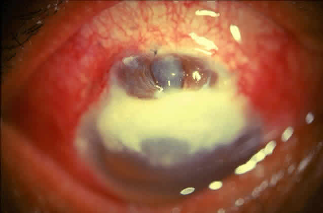 Fungal keratitis is as frequently seen as bacterial keratitis. Aspergillus and Fusarium are the two most commonly isolated organisms. Predisposing factors include trauma, foreign body, and injudicious usage of topical steroids or other indigenous medications. Delay in diagnosis, the relative ineffectiveness of antifungal agents in most parts of the world, and the nonavailability of these drugs hinder prevention and management (Fig. 3).