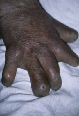 for leprosy of 1 to 10 years.7 It may be 20 or more years after exposure before the diagnosis is made. Leprosy is a chronic, granulomatous infection of the skin, mucous membranes, nerves, eyes, and adnexal tissues of the eyes. The major organs involved are the skin and peripheral nerves, although any organ can be affected, especially later in the disease. Although the bacillus prefers tissues that are cooler than 37°C, bacilli have been found in almost every organ.8 The immunologic defect in leprosy is caused by the selective anergy of T cells to M. leprae and its antigens. This immunodeficiency is either hereditary or acquired through an infection that leads to tolerance from gradual exposure of the patient to the organism. Consequently, cell-mediated immunity is inadequate, and the host is unable to mount an effective response. Using the Madrid classification scheme, there are basically three forms of Hansen's disease: tuberculoid, borderline, and lepromatous, depending on the immune response of the host.9 Diagnosis of these three forms of the disease is made on clinical and histologic findings. The Ridley and Jopling classification includes two polar forms (tuberculoid TT and lepromatous LL), the intermediate form (borderline BB), and a continuum between the two polar forms, giving five disease states (polar lepromatous LL, borderline lepromatous BL, intermediate II, borderline tuberculoid, BT and polar tuberculoid TT).10,11 The disease in any one patient may evolve from one form to another, depending on duration of treatment and immunity. In tuberculoid leprosy, the granulomatous lesions resemble those of tuberculosis, with epithelioid cells, lymphocytes, and giant cells. Acid-fast staining reveals few bacilli in the affected tissues. Clinically, tuberculoid leprosy exhibits only a few discrete skin lesions because of localization of the bacilli. The early skin lesions are sharply demarcated, hypopigmented, and hypoesthetic. The dermal nerves and skin are affected, often symmetrically, with few bacilli being present. Although sensory deficits are a prominent feature, there is little, if any, internal involvement. In lepromatous leprosy, the patient has multiple diffuse lesions. The skin and, to a somewhat lesser degree, the peripheral nerves of the cooler portions of the body are affected early in this form, but sensory changes appear late in the disease process. The skin lesions are less clearly outlined and may be elevated. Later, the skin of the face becomes thickened, producing leonine facies. The internal organs and the eye are more frequently affected than in the tuberculoid form. There appears to be a defect in cell-mediated immunity,12 and the replication of the bacillus is poorly constrained. Histologically, numerous acid-fast bacilli may be seen intracellularly and extracellularly. The lesions typically have many lipid-laden macrophages and many histiocytes. The acid-fast bacilli surround and are within vessel walls. There may also be a mild inflammatory perivascular infiltrate. Borderline leprosy has some characteristics of both the tuberculoid and lepromatous forms of leprosy. The patient may evolve toward either of the polar forms or may remain borderline throughout the course of the disease. The lesions of intermediate leprosy may have variable presentations of skin and peripheral nerve involvement, as well as internal organ and ocular manifestations. The skin lesions are often multiple with either discrete or irregular margins. The histology has characteristics of both polar forms of the disease, with a mixture of epithelioid cells, histiocytes, and some lymphocytes. Acid-fast staining reveals several to many acid-fast bacilli, often found in the nerves. Although the immune status is less well defined, it probably lies between the two polar forms, with some abnormality in cell-mediated immune function but not the profound defect found in lepromatous leprosy.12 Occasionally, one sees reactional states during the course of the disease. These episodes may cause deformities from nerve and soft tissue inflammation and destruction. The reactional states are reversal (type I lepra reactions) and erythema nodosum leprosum (ENL) (type II lepra reactions). In a type I reaction, the reversal reaction represents a delayed hypersensitivity reaction and is directed toward bacillary antigens. The surrounding tissue is damaged as a result of the reaction. This reaction usually occurs in the borderline and unstable states of leprosy and usually after initiation of treatment; it rarely occurs without treatment. A reversal reaction usually arises from an abrupt increase in cell-mediated immunity, and there is a shift of the disease toward the tuberculoid end (called upgrading reaction). It is clinically characterized as fever, edema, hyperemia, infiltration of skin lesions, and severe peripheral neuritis. In borderline disease, it is responsible for loss of nerve function and deformity. A downgrading reaction indicates development of decreased immunity. In this form of reversal reaction, borderline leprosy drifts toward the lepromatous pole. It generally occurs in the absence of treatment. ENL, a type II reaction, is an immune-complex reaction. It occurs in lepromatous or borderline lepromatous patients as a result of immune complex deposition in skin. ENL is characterized by painful erythematous nodules or plaques on the face, arms, and thighs. Fever, malaise, arthritis, orchitis, iridocyclitis, lymphadenopathy, and proteinuria may all occur. The reaction is triggered by a transient imbalance in the patient's immunoregulatory mechanisms. There is an increase in the CD4:CD8 (T helper/suppressor) ratio resulting in release of bacillary antigens from macrophages, which sets the stage for antibody and antigen to combine, fix complement, and attract neutrophils. The Lucio phenomenon, which has occurred in a few lepromatous patients from Mexico and Central America, is probably a variant of E