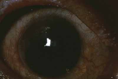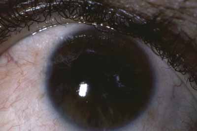 Corneal lepromas (Fig. 4) occur more commonly in South America50 and Japan51 but are relatively infrequent. These lesions are large granulomas with epithelioid cells, lymphocytes, and bacteria. They may become large enough to involve the visual axis and compromise vision. Lepromas usually arise at the limbus (most commonly the lateral limbus) or on the sclera and then encroach onto the cornea. Interstitial keratitis begins in the superior temporal quadrant or in the superior quadrants. It is probably a more severe form of the avascular keratitis, with necrosis and then vascular invasion. Interstitial keratitis may begin without a preceding avascular keratitis in the midstroma of the cornea (superior nasal quadrant) or as a discoid lesion often located superiorly. The interstitial keratitis may progress to involve the visual axis (Fig. 5), with a decrease in visual acuity. Ghost vessels are occasionally seen in mid- to deep stroma in interstitial keratitis, indicating previous inflammatory activity. SCLERAL AND UVEAL LESIONS Episcleritis, scleritis, and uveitis are the initial presenting complaints in up to 16% of leprosy patients.52 The nodular episcleritis that occurs consists of focal leproma with surrounding inflammatory response. There are also more diffuse forms of episcleritis. Episcleritis commonly occurs as part of the ENL reaction, and may be associated with iridocyclitis. Lepromas may occur in the interpalpebral fissure more commonly because this area is cooler. The episcleritis and scleritis may be the result of direct bacillary invasion, but there is strong evidence that some cases may be mediated by immune responses, such as the deposition of immune complexes. Chronic or recurrent scleritis in leprosy may result in scleromalacia and staphyloma (Fig. 6) and, in some cases, disorganization of the globe. Uveitis in leprosy may be the result of several different mechanisms. Uveitis with the erythema nodosum leprosum reaction probably results from a hypersensitivity reaction (probably antigen-antibody mediated)25 and usually occurs with therapy or occasionally after termination of therapy. This iridocyclitis, which also occurs spontaneously, has an abrupt onset and fulminating course with hypopyon, posterior synechiae, and elevated intraocular pressure. Occasionally, there is a spontaneous hyphema presumably because of fragile vessels from previous attacks. This granulomatous uveitis is usually associated with greasy, keratic precipitates. There is also a chronic, low-grade uveitis seen commonly in lepromatous leprosy, which is the principal cause of blindness in ocular leprosy.33,34 This insidious anterior uveitis causes gradual iris atrophy as manifested by loss of iris stroma with a moth-eaten appearance, frank iris holes (Fig. 7), and small, nonreactive pupils. In this condition, iris stromal nerve involvement and disintegration of iris stroma associated with leprosy bacilli can be demonstrated histologically.53 In this “white” iritis, patients have few anterior chamber cells and mild to moderate anterior chamber flare with minimal ciliary flush or conjunctival injection. There are a few scattered, fine, white keratic precipitates. Posterior synechiae are not common and, when present, may be the result of a previous attack of acute iritis. The dilator muscle is affected earlier and to a greater extent than the sphincter muscle, resulting in a small, nonreactive pupil.54 The pinpoint pupil may lead to marked visual loss if there is a corneal or lens opacity. This chronic, low-grade uveitis is more common in patients with lepromatous leprosy, although it may be present in those with tuberculoid leprosy.35 Iris pearls arise from the surface connective tissue of the iris and can be recognized on the iris surface even early in the disease (Fig. 8). These creamy white particles consist of bacilli and monocytes and are rarely associated with an inflammatory response.49 Iris pearls are pathognomonic of ocular leprosy and look like grains of sand on the iris surface, often occurring near the pupillary border. After several years, they may coalesce and drop into the inferior angle, where they can be observed by gonioscopy. Pearls have been reported on the retina55 but probably represent the migration of such spheres to the posterior segment rather than formation there.