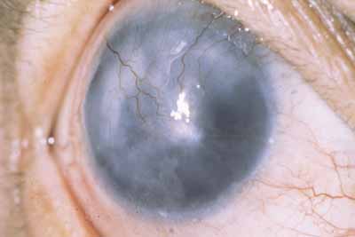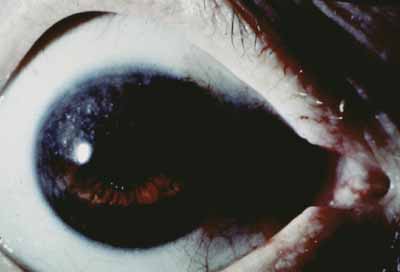 Enlarged, edematous corneal nerves are found in lepromatous leprosy. The nerve involvement has the appearance of focal swelling resembling beads on a string and consists of masses of M. leprae and a surrounding granulomatous response within the corneal nerve. These nerve swellings are pathognomonic of leprosy and may be the first ocular or systemic finding.48 There is also avascular or punctate keratitis consisting of chalky, white, punctate subepithelial opacities that first form in the superior temporal quadrant of the cornea. These are miliary lepromas with macrophages, lymphocytes, and M. leprae.49 The individual lesions gradually become less demarcated with a surrounding haze and eventually becoming confluent. Histologically within these nebulae, discrete calciumlike deposits may be seen, often associated with destruction of Bowman's layer. Superficial neovascularization occurs late in the disease to produce the classic leprous pannus (Fig. 3).49 The bacilli, which produces avascular keratitis, probably reach the cornea by way of the nerves, but deposits also occur adjacent to trachomatous pannus vessels, so that a vascular route is also possible.
