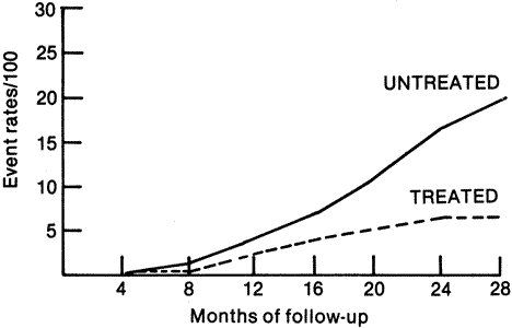 Life tables have the advantage of using the full information on patients followed for various lengths of time. Patients who entered the study too late to be observed for the full time of the analysis are called “withdrawals” in life-table terminology because they are withdrawn from the computations for certain time intervals. Clearly, they are not withdrawn from the study, however, and are considered at risk for as long as they were observed. True dropouts (i.e., patients who refuse to or are unable to return) are analyzed the same way as withdrawals, but the investigator needs to remember that one important requirement of life tables is that all withdrawals be subject to the same probability of an event as nonwithdrawals. No method (including life tables) can adjust for the bias inherent in failure to obtain complete follow-up. Life tables are usually presented in the form of a graph. Either the cumulative proportion with an “event” or the proportion “surviving” without an event may be illustrated. | |||||||||||||||||||||||||||||||||||||||||||||||||||||||||||||||||||||||||||||||||||||||||||||||||||||||||||||||||||||||||||||||||||||||||||||||||||||||||||||||||