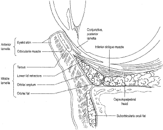 From the arcus marginalis, the septum spans the anterior orbit in a plane deep to the orbicularis oculi muscle and ultimately fuses with the eyelid retractors or tarsus (Fig. 11). In the upper eyelid, the orbital septum adjoins the posterior epimysium of the orbicularis before it fuses with the levator aponeurosis approximately 2 to 3 mm above the superior tarsal border and about 10 mm above the lash line.16 In the lower eyelid, the septum arises from the inferior orbital rim as a condensation of the periorbita and periosteum. It continues anteriorly until it joins with the lower eyelid retractors as a single unit at a point 4 to 5 mm below the inferior tarsus or it inserts on the lower border of the tarsus. The septum travels medially with the pretarsal orbicularis muscle and attaches to the posterior lacrimal crest with a few fibers extending to the anterior lacrimal crest. Laterally, the septum attaches to the deep insertion of the pretarsal segment of the orbicularis muscle and inserts onto the lateral orbital tubercle.17