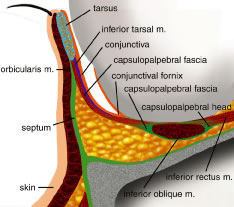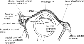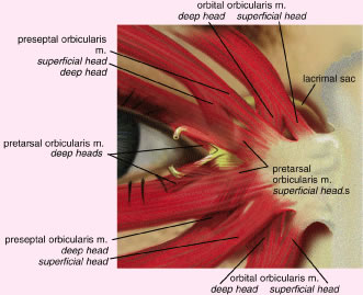 The orbital portion of the orbicularis oculi muscle is the outermost and the largest segment. It is responsible for forcible eyelid closure (squeezing) and voluntary eyelid closure (winking). The orbital portion of the orbicularis muscle originates from the periosteum of the frontal and maxillary bones at the insertion of the medial canthal tendon (MCT). It is a continuous muscle that encircles the orbit before reinserting at the medial canthus inferiorly where it is attached to the periosteum of the posterior lacrimal crest, the lacrimal fascia, and the MCT.12 Superiorly, the orbital portion extends to the eyebrow and interdigitates with the frontalis and the corrugator superioris muscles. Medially, attachments extend from the supraorbital notch to the side of the nasal bone. Inferiorly, the orbital portion arises from the anterior limb of the MCT and the surrounding periosteum and extends to the infraorbital foramen where it continues along the infraorbital margin. Laterally, the orbital orbicularis portion courses over the zygoma and cheek and over the temporal fascia. The preseptal portion of the orbicularis oculi muscle overlies the orbital septum and functions in voluntary eyelid closure (winking) and involuntary eyelid closure (blinking). The action of the superior preseptal orbicularis muscle can also force the eyelid margin below the level of its canthal attachments as seen in looking down.14 The preseptal portion has a superficial origin from the anterior limb of the MCT and a deep origin, called the Jones muscle, which arises from the posterior lacrimal crest and the fascia surrounding the lacrimal crest.8 The orbital segment interdigitates with the preseptal orbicularis muscle and courses laterally across the upper and lower eyelids. The two segments fuse to form the lateral horizontal raphe, which overlies the lateral canthal tendon (LCT) and the lateral orbital rim. The pretarsal portion of the orbicularis muscle is primarily responsible for horizontal movement of the eyelid, which is important in the function of the lacrimal pump. It also assists in eyelid closure mainly during involuntary blinking. The lower one third of the pretarsal muscle in the upper eyelid is adherent to the underlying tarsus, whereas the upper two thirds of the muscle is adherent to the superficial insertion of levator aponeurosis at the superior tarsal border.14 There are two medial insertions of the pretarsal portion of the orbicularis muscle. The superficial head condenses to form the anterior limb of the MCT and inserts into the anterior lacrimal crest. The deep head, called the tensor tarsi muscle of Horner, shares the same site of origin as the preseptal muscle. It inserts on fascia covering the lacrimal sac fossa and on the periosteum of the posterior lacrimal crest. Here, it is identified as the posterior limb of the MCT15 (Fig. 9). Contraction of the Horner's muscle draws the eyelids (especially the lower) medially and posteriorly. The resulting lateral pull on the lacrimal diaphragm creates a negative pressure in the lacrimal sac and draws the tears from the canaliculi into the sac. The deep and superficial heads of the pretarsal orbicularis oculi muscle encircle both lacrimal canaliculi and along with the Jones muscle facilitate tear drainage. Contraction shortens the ampullae of the canaliculi system and facilitates the movement of tears into the sac. The lacrimal drainage system is described in further detail later in the chapter. Laterally, the upper and lower pretarsal muscles fuse to form the LCT and insert 3 to 4 mm deep to the lateral palpebral raphe onto the lateral orbital tubercle. The deep medial and lateral attachments of the pretarsal orbicularis oculi muscle are important in maintaining eyelid to globe apposition. ORBITAL SEPTUM The orbital septum is a thin, fibrous, multilayered sheath that arises from the anterior periorbita (periosteal lining of the orbit) at the arcus marginalis (Fig. 10). The orbital septum separates the eyelids from the orbit and serves as an important anatomic barrier to infection, hemorrhage, and edema. Inflammatory or infectious processes anterior to the septum are considered preseptal, whereas similar findings posterior to the orbital septum are considered orbital. In older individuals, the septum can become tenuous. Orbital or preaponeurotic fat is an important anatomic landmark and herniation of orbital fat through the septum from trauma or surgery indicates a disruption of the orbital septum.