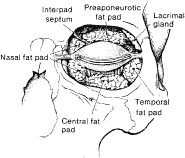In the Asian eyelids, the eyelid creases vary in position in relation to the eyelid margin and may be lower than the occidental eyelid, or they may be absent altogether. In the upper eyelid, the orbital septum may fuse with the aponeurosis as is inserts into the tarsus. This insertion can occur as high as the superior border of the tarsus or as low as the lash line accounting for the lower or absent upper eyelid crease.3 There are also differences in the Asian lower eyelids. Epiblepharon is a common finding in the Asian lower eyelid and is seen as an additional fold of skin running horizontally below the lower eyelid margin. It is often associated with a loss of the eyelid crease or with a crease that rests very close to the eyelid margin of the lower eyelid. The absence of an eyelid crease may be due to lack of deep anchoring of the superficial skin to the preseptal portion of the orbicularis oculi muscle.18 An overriding orbicularis muscle is also associated with epiblepharon. The weight of the skin fold and the orbicularis muscle may rotate the lower eyelid margin inward, creating an entropion. FAT Fat within the orbit and eyelids serves as a protective cushion for the globe and facilitates movement of the globe. There are three general locations of fat that are described: eyelid, sub-brow, and orbital. In the upper eyelid, there are two fat pads, medial and central (preaponeurotic) (Fig. 12). The central preaponeurotic fat is divided by the trochlea of the superior oblique tendon and fascial strands of the medial retinaculum. These divisions are arbitrary and the fascial planes can be variable, because eyelid fat is interconnected and contiguous with deeper orbital fat. The preaponeurotic fat pad is an important surgical landmark, because it lies just posterior to the orbital septum and anterior to the levator aponeurosis (Fig. 13). The central preaponeurotic fat pad tends to be yellow as compared with the whiter more fibrous medial fat pad. The medial fat pad is derived from orbital fat deep to the levator muscle. It is more vascular because of the location of the palpebral arterial arcade that serpiginously courses through the medial fat pad.19,20 The lacrimal gland occupies the temporal space lateral to the central preaponeurotic fat pad. The lacrimal gland is a firm, pink, vascular, lobulated structure that produces the aqueous component of the precorneal tear film. (The anatomy and function of the lacrimal gland is described later in the chapter.) Care must be taken to avoid excision of the lacrimal gland while liposculpturing during blepharoplasty. Fine connective tissue septa extend anteriorly from the capsule of preaponeurotic fat to the orbital septum and posteriorly to the levator aponeurosis.17 The postaponeurotic or pretarsal space, located between the levator aponeurosis anteriorly and the tarsus posteriorly, may contain a small amount of peripheral orbital fat. The fibrous septa compartmentalizing superficial and deep orbital fat and extensions of the fascial sheaths of the orbital muscles and eyelid structures are of great importance to the movement of the upper eyelid.