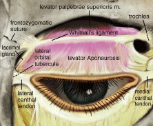 In the upper eyelid, the LPS muscle begins to develop at about 10 weeks of fetal life.14 The LPS muscle arises from the lesser wing of the sphenoid bone at the orbital apex above the annulus of Zinn and superolateral to the optic foramen. The mesenchymal origin of both the levator and the superior rectus muscles is immediately below at the annulus of Zinn. The first 40 mm of the LPS is the muscular portion, and the remaining anteriorly projecting 14 to 20 mm becomes the levator aponeurosis.10 The levator muscle crosses over the superior transverse ligament of Whitnall (STL), which is a condensation of horizontally oriented connective tissue resting within the anterior aspect of the fibrous sheath surrounding the body of the levator muscle.29 Whitnall's ligament marks the junction where the LPS changes from a skeletal muscle to a fibrous sheath, the levator aponeurosis. STL, composed of collagen and elastic fibers, is seen as a white line traversing horizontally across the eyelid, approximately 10 mm above the superior border of the tarsus (Fig. 16). The STL medially attaches to the trochlear fascia and superior oblique tendon and sends wisps of connective tissue to the medial retinaculum. It attaches laterally to the fascia surrounding the orbital portion of the lacrimal gland and at the frontozygomatic suture. The STL acts to suspend the levator complex and also serves as a fulcrum, adding a mechanical advantage to levator muscle action on the upper eyelid.3 Just posterior to Whitnall's ligament a dense intermuscular fascia interconnects the undersurface of the levator aponeurosis and the superior surface of the superior rectus muscle. A superior conjunctival fornix suspensory ligament arises from the anterior surface of this intermuscular membrane.30,31 The superior rectus muscle and the levator muscle are also joined by fibrous attachments along their medial borders. The horns of the levator aponeurosis are broad fibrous condensations in the lateral and medial edges and should be distinguished from the STL. The lateral and medial horns of the levator aponeurosis and its osseous insertions are located inferior to the STL. The lateral horn has more strength and is more tendinous than the less dense medial horn. Laterally, it courses through the lacrimal gland, dividing the gland into the palpebral and orbital lobes. The lateral horn continues inferiorly to join the lateral retinaculum and together they form a strong insertion into the lateral orbital tubercle. The medial horn of the levator aponeurosis passes over the superior oblique tendon where it has weak attachments from the STL. The medial horn continues medially to join the medial retinaculum to reach the MCT and posterior lacrimal crest. The weaker attachments medially are thought to allow a greater mobility of the medial upper eyelid.32 The lateral and medial posterior attachments are important in eyelid to globe apposition. The levator aponeurosis continues anteriorly until it joins with fibers of the orbital septum about 2 to 3 mm above the tarsal border. The orbital septum fuses with the aponeurosis at or just above the eyelid crease. At this point, additional fibers interdigitate with the orbicularis oculi muscle. The eyelid crease may vary but is typically located near the superior edge of the tarsal border at about 8 to 10 mm above the eyelid margin.29 The actual eyelid crease is formed from the attachment of the levator aponeurosis to the preseptal orbicularis muscle and subcutaneous tissue. The levator aponeurosis sends connective tissue attachments to insert on the lower one third of the anterior surface of the tarsus with its strongest attachments 3 mm above the eyelid margin.33,34,35 These tarsal attachments are crucial for upper eyelid function. Attenuation of the levator muscle and dehiscence of its attachments may demonstrate aging changes of the upper eyelid. This can result in elevation of the eyelid crease as seen in involutional blepharoptosis.3 Congenital and acquired ptosis is a drooping of the upper eyelid usually caused by poor elevating power of the upper eyelid. Congenital ptosis is typically characterized by lagophthalmos and an absence of an eyelid crease resulting from fibrofatty degeneration and poor function of the LPS. There are several classifications of ptosis. (See Volume 5, Chapter 78.) Muller's muscle, also known as the superior tarsal muscle, is the other retractor muscle of the upper eyelid (Fig. 17). It is a smooth, sympathetically innervated muscle that acts in concert with the levator muscle to elevate the upper lid. Sympathetic innervation is derived from nerve fibers, which travel along the peripheral arterial arcade and other small arteries.29 Muller's muscle is highly vascularized and is often a source of bleeding in surgery. It originates from the underside of the levator muscle approximately 20 to 22 mm above the superior tarsal border at the origin of the aponeurosis.24 High in the eyelid, Muller's muscle is loosely attached to the aponeurosis anteriorly and to the conjunctiva posteriorly. It is more adherent posteriorly to the conjunctiva as is nears the upper boarder of the tarsus. The superior tarsal muscle inserts into the upper border of the tarsal plate. Clinically, increased sympathetic stimulation as seen in fright or Grave's ophthalmopathy can retract the upper lid 2 to 3 mm above the normal resting position. Diminished tone as seen in fatigue, paralysis, or Horner's syndrome may cause the lid to drop as much as 2 mm. Topical administration of a short-term sympathomimetic agent (i.e., phenylephrine) can be used to determine preoperatively the effect of tarsal muscle surgery on ptosis.36,37 A positive result following topical administration of phenylephrine is elevation the upper eyelid 2 to 3 mm, which suggests that Muller's muscle resection may be beneficial. (See Volume 5, Chapter 78.) The retractor muscles of the lower eyelids include the inferior tarsal muscle and the 