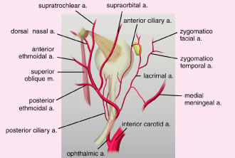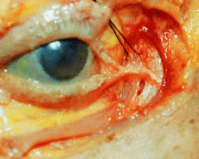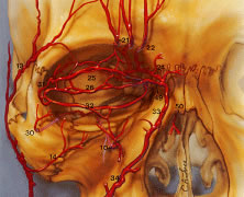 The accessory lacrimal exocrine glands of Wolfring and Krause structurally are similar to but much smaller than the main lacrimal gland. They mainly are located in the superior conjunctival fornix and above the tarsus, and fewer lie in the inferior conjunctival fornix. These are called the basal secretors because they lack direct secretory motor fibers. Other basal secretors include sebaceous glands (meibomian and Zeis) and mucous glands (goblet cells). The accessory lacrimal glands provide the tears for daily corneal hydration and secrete the aqueous layer of the tear film. Drainage of tears begins with the lacrimal puncta located medially on upper and lower eyelid margins. The punctal orifice is directed posteriorly towards the lacrimal lake where it accepts the tears. Lacrimal papillae are seen as a fibrous ring on the eyelid margin surface surrounding the lacrimal puncta. The puncta is the opening to the lacrimal drainage system and empties into the ampulla. The ampulla is oriented 1 to 2 mm vertically and is surrounded by a portion of the pretarsal orbicularis muscle and opens into the canaliculus. The canaliculus is a horizontal structure, which is directed between the plica semilunaris and the caruncle. The canaliculi are surrounded by thick pretarsal orbicularis oculi muscle fibers. The upper canaliculus in the upper eyelid is approximately 8 mm long, and the lower canaliculus is approximately 10 mm long in the lower eyelid. The blinking action of the muscles of the eyelid helps direct tears medially toward the puncta46 (Fig. 26). Capillary attraction allows tears to enter the punctum into the ampulla and canaliculus. On eyelid closure, the ampulla collapses, while the canaliculus shortens. The action of the lacrimal pump is then to draw tears through the canaliculi into the lacrimal sac, which is approximately 10 mm long. Gravity forces fluid through the elastic nasolacrimal duct, measuring approximately 12 mm, into an opening or ostium at the inferior meatus of the nose and into the nasopharynx. Valve-like folds of epithelium line the nasolacrimal duct preventing the retrograde flow of tears and air. The valve of Rosenmüller is located at the junction of the common canaliculus as it enters the nasolacrimal sac. This fold prevents reflux of tears back into the sac from the canaliculi. An incompetent valve may allow reflux of purulent material from the sac into the eye in nasal lacrimal duct obstruction. The valve of Hasner is located on the distal end of the duct. This is often imperforate at birth in neonates and is a major cause of epiphora in infants. It usually undergoes perforation within 6 months after birth spontaneously or after manual massage of the sac. VASCULAR SUPPLY A network of vessels derived from two major sources, the internal and the external carotid arteries, richly vascularizes the eyelids (Fig. 27). The internal carotid artery supplies the deep or intraorbital vascular system including the ophthalmic artery, whose terminal branches primarily supply the upper eyelid. The external carotid artery supplies the superficial arterial system namely facial and angular arteries, which principally supply the lower eyelid. Collateralization between the internal and external systems contributes to the rapid wound healing and the low incidence of infection following eyelid surgery. As the vessels approach the eyelids, branches of the ophthalmic artery from the internal carotid artery and branches of the lacrimal arteries off of the maxillary branch of the external carotid artery form the marginal and peripheral vascular arcades of the eyelids. At the orbital apex, the ophthalmic artery, a branch of the internal carotid artery, enters the orbit through the optic canal lateral to the optic nerve (Fig. 28). As the ophthalmic artery passes over the optic nerve and continues supermedially within the orbit, four terminal branches pierce the orbital septum to supply the upper eyelid. The four branches include the lacrimal artery, the supraorbital artery, the supratrochlear (frontal) artery, and the dorsal nasal artery.47,48 The lacrimal artery runs temporally along the upper border of the lateral rectus muscle along with the lacrimal nerve and terminates as the lateral palpebral artery. This is the blood supply to the lacrimal gland, the conjunctiva and the lateral aspect of the upper eyelids. The supraorbital artery branches off the ophthalmic artery as it courses over the optic nerve and travels forward between the levator muscle and the periorbita of the roof. It accompanies the supraorbital nerve through the supraorbital foramen to supply the upper eyelid, scalp, forehead, levator muscle, periorbita, and diploë of the frontal bone.3 The supratrochlear (frontal) artery accompanies the supratrochlear nerve to supply the skin of the superior medial aspect of the orbit, the forehead, and scalp. The ophthalmic artery pierces the orbital septum dorsonasally to become the dorsal nasal artery. This supplies the skin of the bridge of the nose and the lacrimal sac, terminating as the medial palpebral artery. The medial palpebral artery and the lateral palpebral artery anastomose to form the vascular arcades of the upper eyelids. The marginal palpebral arcade lies on the anterior tarsal surface 2 to 3 mm from the eyelid margin. The peripheral palpebral arcade courses above and parallel to the superior border of the tarsus, between the levator aponeurosis and Muller's muscle in the upper eyelid. Medially, the arcades run a tortuous course throughout the medial fat pad. The medial fat pad is often a site of bleeding during blepharoplasty.20 The deep peripheral palpebral arcade anastomoses with the anterior ciliary arteries near the corneal scleral limbus and supplies the superior conjunctival fornix.3 In the lower eyelid, a marginal arcade arises from the medial and lateral palpebral branches running horizontally approximately 3 mm inferior to the lower eyelid margin and anterior to th