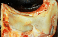 The nasolacrimal duct derives from ectodermal tissue in the nasolacrimal groove between the lateral nasal and maxillary processes.6 This tissue is known as the nasolacrimal ectodermal cord. Mesenchymal tissues from the maxillary process cover the ectodermal tissue medially, before it canalizes. The central cells of the cord degenerate until there is a superior membrane composed of canalicular and conjunctival epithelium, as well as an inferior membrane of nasolacrimal and nasal epithelium. These superior and inferior ends are usually patent at the time of birth. The lacrimal gland arises from an outpouching of the conjunctiva as a modified salivary gland. Mesodermal tissue from the second brachial arch spreads to cover the entire head and neck by way of myoblast induction. This superficial embryonic muscle plane becomes the superficial skeletal muscle of the eyelids. The orbicularis oculi, corrugator supercilii, and procerus muscles arise from the infraorbital lamina, immediately below the orbital rim, whereas the frontalis muscle develops from the temporal lamina. Aponeurotic fibers of the galea envelop the developing frontalis muscle and split into deep and superficial layers. The thinner superficial galea continues as the anterior muscle sheath of the frontalis and orbicularis, whereas the deep galea encompasses the sub-brow fat and continues into the eyelid as the posterior orbicularis fascia.7 Eyelid dysjunction occurs at approximately 21 to 26 weeks of gestation and results from keratinization of the eyelid margins, contraction of the inferior eyelid retractors, and secretion of sebum by the meibomian glands.8 Although separation of the eyelids is usually complete by the sixth month of gestation, it may persist until shortly before birth. Failure of eyelid separation may result in conditions such as ankyloblepharon, blepharophimosis, epicanthus, and euryblepharon. Nests of melanocytes presenting on the eyelid margins at the time of separation may form kissing nevi that can be seen after birth. |