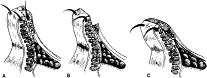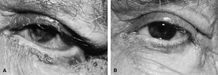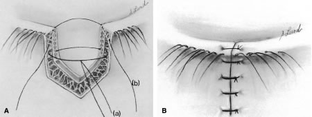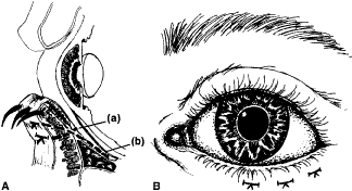 the sebaceous unit. Trichiasis is an acquired condition in which eyelashes are misdirected posteriorly toward the conjunctiva or cornea. If contact is made with the conjunctiva, a foreign body sensation and localized conjunctival vascular injection result. Corneal involvement produces pain and photophobia, generally correlating with the degree of epithelial involvement. The etiology of trichiasis may be obvious following trauma or surgical interruption of the eyelid margin. However, chronic inflammatory conditions, ranging from blepharitis and chalazion to conjunctival cicatricial disorders such as ocular pemphigoid or Stevens-Johnson syndrome, also frequently result in trichiasis. Scarring conditions of the conjunctiva produce a particularly frustrating combination of features: entropion, trichiasis, distichiasis, and epidermalization of the eyelid margin. Trichiasis is simply a misdirection of lashes toward the globe. In distichiasis, lashes or hairs emanate from the meibomian orifices. Anderson and Harvey71 have histologically evaluated congenital and acquired distichiasis and have identified pilar units associated with the meibomian glands; these authors view this as representing a reversion toward a pilosebaceous apparatus. A chronic inflammatory stimulus such as chronic cicatricial pemphigoid, erythema multiforme, chemical injury, trachoma, chronic blepharitis, and chronic allergies may initiate this regressive metaplasia of the meibomian glands to produce acquired distichiasis. Scarring of the posterior lid lamella can lead to a rotation of the ciliary portion of the lid margin towards the globe. In this situation, it may appear as if lashes are emanating from the posterior lid margin, but close examination with the slit lamp will show that the most posterior lashes are not arising from meibomian gland orifices and are not distichiasis. The management of trichiasis can be challenging for both the patient and the physician. Recalcitrant or recurrent lashes are not unusual, despite a systematic approach to this condition. Initial consideration determines the etiology of trichiasis. Trichiasis following interruption of the lid margin either from trauma or surgical manipulation will have a corresponding local lash abnormality. These abnormalities are often avoided with careful approximation and tension-free closure of the eyelid margin (see Fig. 4). In addition, removal of tumors from the eyelid margin, such as papillomas and dermal nevi, should employ a chopping-block type shave biopsy parallel to the surrounding surface of the skin or lid margin. A shave biopsy extending beyond this plane would produce a divot at the eyelid margin and would also interrupt the pilosebaceous apparatus at the anterior lid margin. Trichiasis may result from scarring around the lashes, producing some posterior misdirection of the lash. If complete eyelid margin tumor excision is desired, a full-thickness resection of the eyelid (see Fig. 4) should be performed. Epithelialization and dryness of the caruncle,73 progressive conjunctival inflammation, cicatrization, subepithelial fibrosis, blunting of the fornices, symblepharon formation, trichiasis, distichiasis, and entropion characterize the clinical presentation of ocular pemphigoid. The disease can progress to keratinization or vascularization of the corneal surface, leading to blindness. The relentlessly progressive nature of ocular pemphigoid can be interrupted by the institution of immunosuppressive therapy, after histologic confirmation of the disorder.56–58 The management of trichiasis requires a stepwise approach. The degree of trichiasis and type of lashes are important in planning therapy. Localized abnormal lashes generally respond better to the ablative procedures than does diffuse trichiasis. Electrolysis is best suited for localized normal sized lashes. Finer lanugo hairs are generally less responsive to electrical ablative techniques. Extensive electrolysis may produce scarring of the eyelid margin and secondary cicatricial changes, complicating later management. Local anesthesia (2% lidocaine with or without epinephrine) is first administered, then the lid is everted from the globe and an electrolysis needle is introduced directly into the lash follicle under slit-lamp visualization. A useful instrument for electrolysis is the Prolectro epilator with a power setting of 4. The orientation of the follicle generally corresponds to the direction of the lash emanating from the follicle. The electrolysis needle should be advanced into the full extent of the lash follicle, which is approximately 2.4 mm in the upper lid and 1.4 mm in the lower lid.72 Current is applied until frothy bubbles emerge from the lash follicle, which generally requires approximately 15 to 20 seconds of electrical stimulus. A circular or rotating motion of the needle around the lash will fully ablate the follicle. After adequate treatment, the lash is easily removed. Another effective instrument for electrolysis is the Ellman radiosurgery unit using the 0.004 wire electrode, which is insulated except for the tip. A power setting of 2 using the partially rectified current works well. Again, it is essential that the electrolysis tip penetrate the full extent of the eyelash follicle so that it can be ablated. The Ellman unit requires only a few seconds compared with the Prolectro instrument. The success rate for electrolysis should be 80% to 90% with a single treatment. Trichiasis recurrences can be retreated with repeat electrolysis. Fine lanugo hairs present a challenge for electrolysis. They typically do not have a large enough follicle to permit the advancement of an electrolysis needle. It is possible to create a pathway for the electrolysis needle by first introducing a hypodermic needle. However, this may not actually pass along the true path of the hair follicle. It is also possible to use the blended cutting action of the Ellman unit so that the electrode tip can a