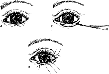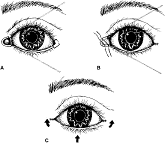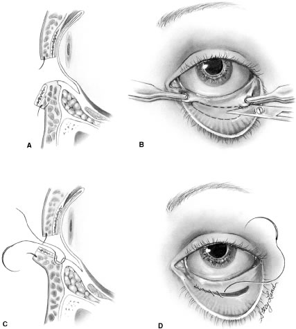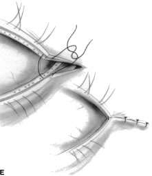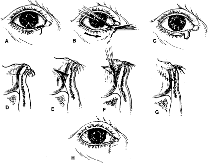 factors. INVOLUTIONAL ECTROPION Involutional ectropion evolves slowly secondary to eyelid laxity and tractional forces of the anterior lamella. This may result from mild cicatricial changes of the skin or orbicularis muscle or a mechanical or gravitational eversion of the eyelid margin. There is generally a progression from eyelid laxity to punctal ectropion, medial ectropion, and then generalized ectropion. If the punctum is slightly everted from the lacus lacrimalis, tears cannot effectively drain into the canalicular system. In addition, the siphoning effect of the lacrimal excretory system, as demonstrated by Doane,15 is not generated if the lacrimal puncta do not occlude on lid closure and do not approximate the lacus lacrimalis. With the puncta approximated, attempted eyelid opening creates negative pressure within the lacrimal excretory system. When the puncta initially separate, the negative pressure siphons tears from the lacus lacrimalis. Also, horizontal eyelid laxity may produce a flaccid canalicular syndrome or poor lacrimal pump, so that tears are not siphoned from the lacus lacrimalis.16 This tearing malfunction is aggravated by the chronic ectropion and eyelid retraction that produce lagophthalmos and secondary exposure keratopathy. With time, the exposed conjunctive thickens and keratinizes, producing further ocular irritation. Mild medial ectropion is manifested by rotation of the punctum away from the ocular surface causing mild tearing. This can be treated with a one- or two-snip punctal plasty, establishing anatomic continuity between the canalicular system and lacus lacrimalis in the medial canthal angle. This procedure is performed by opening the punctum and vertical canaliculus with a single snip of a sharp iris or Westcott scissors or by excising a very thin “V” wedge (two snips). This procedure may also be helpful after ectropion repairs if a mild eversion of the puncta remains. This can be performed as an office procedure. A cotton-tipped applicator saturated with 4% lidocaine solution held over the punctum and adjacent palpebral conjunctiva usually provides adequate anesthesia. If it does not, a 30-gauge hypodermic needle can be passed through the punctum and vertical canaliculus so that 1% or 2% lidocaine can be infiltrated into the pericanalicular tissue. Medial ectropion, when more severe, may require surgical intervention. Surgery directed at the lateral canthal angle, as discussed later in this chapter, does not fully alleviate medial lid malpositions, and this approach is not universally successful in restoring eyelid position. Removal of a conjunctival and lower lid retractor spindle may be necessary. The spindle is directly beneath the tarsus with its long axis directly parallel to the eyelid margin (Fig. 3). The conjunctival retractor spindle should measure no more than 5 mm in a vertical dimension, to prevent postoperative retraction and entropion resulting from posterior lamellar shortening. In essence, the closure of this internal lamellar resection creates a direct tightening of the medial lower lid retractors. Full-thickness lid sutures tied over a firmly rolled cotton or silicone bolster have been described by Collin.17 Although this technique is a short-term nuisance for the patient, it does result in a superior inward rotation of the punctum and lid margin without retraction. For cases of prominent medial ectropion, the Byron Smith “Lazy T” procedure combines a horizontal lid-tightening procedure with a lower lid retractor resection.18 This combined procedure inverts the eyelid margin to its appropriate anatomic position. Full-thickness eyelid resections and repairs have been poorly demonstrated and reported in the ophthalmology and plastic surgery literature. The concept of a wedge resection or pie-shaped tarsal resection should be totally discarded. In its place, full-thickness modified pentagonal block resections should be used (Fig. 4). Incision through the eyelid should be perpendicular to the lid margin. If the eyelid resection is wedge shaped, the repair or approximation of the lid results in a notch or valley of the eyelid margin at the incision site. The layered repair of the lid margin defect should start with approximation of the tarsus. Adequate tarsal approximation provides the foundation for lid reconstruction and removes all tension from the eyelid margin. As a result, lid notches or trichiasis should be almost nonexistent. The initial interrupted sutures should be placed through the base or inferior border of the tarsus to promote tension-free lid approximation (see Fig. 4A, suture a). The first suture for tarsal approximation is a 5-0 or 6-0 polydioxamone (PDS) or polyglactin (Vicryl) with a spatula-style needle. If excessive lid tension is evident, a 5-0 suture is preferable. The PDS is an absorbable suture that retains its tensile strength for 6 weeks and promotes little tissue reaction. Vicryl is also an absorbable suture that retains its tensile strength for 3 to 4 weeks. It may be more prone to cause tissue reaction in some patients. Horizontal approximation of the cut edges of the lower lid retractor with interrupted 6-0 PDS sutures may also help to reduce horizontal lid tension. Continuous running sutures through the lower lid retractors from the inferior aspect of the modified pentagonal lid resection to the base of the tarsus result in a downward traction of the eyelid resulting from vertical shortening of the lid retractors and should be avoided.19 To avoid a suture that is tied at the lid margin, a superior tarsal suture is initiated on the anterior tarsal surface approximately 2 mm from the cut edge of the tarsus and 2 mm inferior to the lid margin (see Fig. 4A). The suture is then angled to exit the cut surface of the tarsus at the posterior lid margin. The opposing suture is then placed from the posterior lid margin to exit the tarsus at 2 mm from its cut edge and 2 mm from the lid margin. Tying this sutu