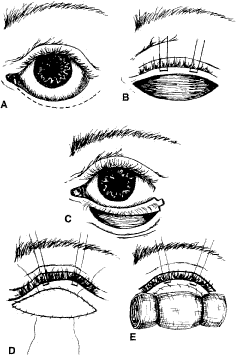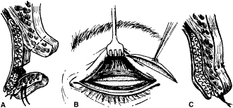 Internal scarring procedures to stabilize the eyelids have been very helpful in minimizing ocular irritations. Quickert and Rathbun48 advocated suture repair for entropion (Fig. 14A, suture a), and Iliff49 later modified this procedure (see Fig. 14A, suture b). The placement of horizontal mattress sutures from the inferior fornix to exit the skin directly beneath the eyelashes (as in the Iliff modification) enhances the everting forces of the eyelid. This procedure is easy to perform and serves as an excellent temporizing procedure until a more definitive procedure is possible. In eyelids with a minimal degree of horizontal lid laxity, such treatment may suffice indefinitely. In eyelids with a greater degree of horizontal laxity, care must be taken not to use too much eversion effect with the Iliff modification, or an immediate ectropion can be created. Also, in eyelids with spastic entropion, such as following ocular surgery or ocular irritations, this procedure may stabilize the lid until the irritating focus has resolved. The type of suture material used for Quickert-Rathbun sutures is not as important as the tension with which the sutures are tied. The suture tension can lead to focal tissue necrosis and scarring, giving Quickert-Rathbun sutures the potential for some permanent correction. Double-armed sutures provide the safety of making all suture passes away from the globe. 4-0 chromic gut sutures generally remain in place for 2 weeks, which is long enough to provide the necessary effect without the need for scheduled suture removal. Silk and polyglactin sutures will last longer but can lead to tissue infections resulting from the duration and their polyfilament structure. Nylon sutures are less likely to cause infection but are sometimes uncomfortable for the patient because of their stiffness. Patients with entropion usually require a combined procedure to eliminate horizontal lid laxity and repair the lower lid retractors.50 No procedure addressing an isolated anatomic feature has been universally successful in alleviating entropion. Isolated repair of lower lid retractor defects (analogous to repair of the levator aponeurosis in ptosis procedures) often results in lower lid retraction or actual ectropion.51–53 This is due to the preexisting significant horizontal eyelid laxity, which again promotes an unstable eyelid margin. The tendency is further exacerbated if the lower eyelid retractor is inadvertently advanced onto the tarsus. If horizontal eyelid laxity is evident, a tarsal strip procedure should be performed, as discussed for the treatment of ectropion (see Fig. 6). Various suture placements through the lateral tarsal strip as in the correction of ectropion or entropion described by McCord and coworkers54 are not relevant. The goal of the tarsal strip procedure is to firmly affix the tarsus to the inner aspect of the lateral orbital rim. This is best accomplished by using two interrupted 5-0 nonabsorbable monofilament sutures, although some surgeons prefer 4-0 or 5-0 polyglactin. The sutures should be tied on the anterior tarsal surface; attempts to bury the knots beneath the tarsus will prevent adequate tarsal approximation to the inner aspect of the lateral orbital rim. The preferred procedure for involutional entropion thus consists of a lateral tarsal strip and repair of the lower eyelid retractors. Isolated lower lid retractor repairs are inappropriate—an invitation for additional procedures. A lateral canthal incision is created and extended in an infralash position, and a skin muscle flap is elevated to expose the orbital septum (Fig. 15B and C). The orbital septum is penetrated and orbital fat identified and retracted inferiorly. Directly beneath the orbital fat is the white fibrous appearing lower eyelid retractor. This is directly analogous to the location of the levator aponeurosis in the upper eyelid. The lower eyelid retractor is normally attached to the inferior tarsal border; however, in entropion, a defect is generally apparent between the lower eyelid retractor and the tarsus. The superior edge of lower eyelid retractor system is identified and carefully reapproximated to the inferior tarsal border (see Fig. 15D and E). Care should be taken not to advance the lower eyelid retractor to prevent lower eyelid retraction or actual ectropion. A lateral tarsal strip procedure as described in the section on ectropion should then be performed to tighten the eyelid horizontally (see Fig. 6). Herniated orbital fat is an important etiologic factor in promoting orbicularis muscle overriding and creating tarsal instability. Redundant orbital fat is carefully removed. To finalize the procedure, redundant skin is draped over the lid margin and is excised as in a lower lid blepharoplasty. Skin removal should be minimal to prevent ectropion. It is this combination type of procedure that produces minimal recurrences and has been extremely successful in managing entropion. The Weis (transverse tarsotomy) procedure has also been advocated for the correction of entropion. This procedure everts the lid margin and produces an anatomic barrier that prevents preseptal orbicularis muscle override and secondary tarsal rotation (Fig. 16). It has been advocated for involutional entropion but is best suited for patients with varying degrees of cicatricial entropion. The Weis procedure has been called the two-snip procedure and is relatively easy to perform. A stab incision is created through the full thickness of the lid at the inferior aspect of the tarsus approximately 3 mm from the eyelid margin (Fig. 16A). A sharp iris scissors is used to extend the full-thickness lid incision nasally and temporally (hence the two-snip procedure) (see Fig. 16B). The short vertical height of the tarsus of the lower eyelid,55 especially in patients with cicatricial entropion, makes the incision of the tarsus challenging. An alternative method of creating this full-thickness horizontal eyelid in