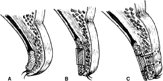 If medial canthoplasty is necessary to facilitate lid elevation or to narrow the palpebral fissure, a variation of the standard procedure is helpful to minimize horizontal lid narrowing. Traditionally, medial canthoplasties involve direct approximation in the medial canthal angle in which the medial eyelid is zippered closed.37 This results in a horizontally narrowed palpebral fissure, with minimal elevation of the retracted lower eyelid. A medial canthoplasty is more effectively performed by supporting the lower lid with the superior crus of the medial canthal tendon (Fig. 11). This is accomplished by the approximation of a lateral portion of the lower medial canthal angle to a more nasal portion of the upper medial canthal angle (see Fig. 11B). The nasal portion of the eyelid is then supported by the superior crus of the medial canthal tendon. The lower eyelid thereby assumes a higher position with minimal horizontal narrowing of the palpebral fissure. Often, the upper eyelids require surgical intervention to minimize lagophthalmos in patients with facial paralysis. In most texts that deal with eyelid malpositions, the upper eyelid is unfortunately neglected in this discussion. Many procedures have been advocated to minimize lagophthalmos. These procedures include temporalis muscle transfer, upper eyelid weights, stainless steel springs, eyelid magnets, and the fil d'Arion procedure. All of these operations have extensive complications. Lid-loading (eyelid weight) procedures had been discouraged in the treatment of lagophthalmos secondary to facial palsy and orbicularis muscle paralysis, primarily because of the high rate of extrusion of implanted devices. Kelly and Sharpe38 reported an extremely high complication rate of 68% in paralytic eyelids following gold weight implantation. Complications included extrusion (43%), migration (18%), and infection (7%). Gold weight implantation has been re-evaluated and is extremely effective in minimizing lagophthalmos.39,40 The high incidence of complications was a result of improper gold weight implantation techniques. The gold weight procedure can be regarded as re-animation by gravitation. May39 re-evaluated lid-loading procedures and greatly improved surgical techniques, almost eliminating complications. May recognized that the main disadvantage of traditional loading procedures was the superficial placement of the weight. A muscular pocket could not support the gold weight, allowing migration and extrusion. In the eyelid, the orbicularis muscle fibers easily separated, and the thin, delicate eyelid skin then became the sole barrier to extrusion. Complications have been dramatically reduced by deeper weight fixation within the eyelid. A small pocket is created by elevating the levator aponeurosis from the tarsus and Müller's muscle (Fig. 12). The gold weight is then sutured to the superior tarsal border and undersurface of the levator aponeurosis and migration and extrusion are virtually eliminated. Also, deep fixation of the gold weight minimizes deformity of the upper lid and will only be apparent in those patients with a sunken superior sulcus. The size of the gold weight is determined preoperatively by taping the weight onto the eyelid and observing the lid closure. Lid closure must be ensured without inducing ptosis from an excessive weight. The most frequently used weights are 1 g and 1.2 g. It should be noted that the gold weight will allow prolonged lid closure but will not recreate the spontaneous blink reflex. Spring implantation is a much more difficult procedure with a high rate of extrusion, but this does provide a more spontaneous blink.35 Part of the benefit of upper lid gold weights comes from the elimination of upper lid retraction caused by upper lid retractors working in the absence of normal opposing orbicularis oculi muscle protractor tone. The creation of a very mild upper lid ptosis can further protect against the corneal irritation caused by incomplete spontaneous blinks and incomplete voluntary closure. Müller's muscle excision to lower the upper lid position can improve the symptoms and corneal surface integrity of facial palsy patients even without implantation of a gold weight.41 FLOPPY EYELID SYNDROME Floppy eyelid syndrome was first described by Culbertson and Ostler in 1981.42 This is a condition most often seen in overweight males. There is significant laxity of the eyelid tissues. It is generally bilateral but may be asymmetric. Retraction of each eyelid leads to its eversion. Ophthalmologically, this condition shows some thickening of the tarsal plate along with low-grade chronic inflammation that may be seen in any of the lid tissues. No specific etiologic factor has been determined.43 There is a high correlation of obstructive sleep apnea in patients with the floppy lid syndrome.44 Perhaps there is some type of connective tissue disorder. However, overweight men are also at more risk for developing sleep apnea. Patients with floppy eyelid syndrome may experience spontaneous eyelid eversion. This was the initial presenting symptom that drew attention to the problem. It is more likely to occur on the side on which a patient sleeps. This is typically the most severely involved side in asymmetric cases. There is also eyelid imbrication in which the lax upper lid rides over the margin of the lower lid on eyelid closure.45 The leads to a chronic irritation of the tarsal conjunctiva of the upper lid. Typically, there is a thickening of the upper lid with erythema and chronic papillary conjunctivitis. Ocular lubricating ointments and corticosteroids can help decrease some of the inflammation that occurs and antibiotics can control secondary infections. However, horizontal eyelid shortening of the upper and sometimes also the lower lids can produce a more lasting improvement.46,47 These eyelids are often extremely lax and fairly large horizontal resections are necessary to restore appropriate horizontal tension to