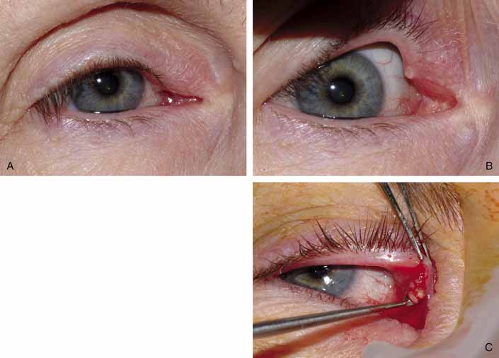 Stenosis can occur from involutional causes as well as from viral infections, such as herpes and varicella. Stenosis may also be the result of the toxic effects of certain topical medications. These include epinephrine-based products or long-acting anticholenergic agents used in the treatment of glaucoma.36,37 Systemic chemotherapy can also induce canalicular stenosis,38,39 which can be preemptively treated with Silastic intubation prior to starting therapy. Canalicular stenosis is a much more serious surgical problem. For generalized but mild stenosis, Silastic intubation may suffice. If the obstruction is severe, however, a bypass procedure with the insertion of a Jones-type Pyrex tube combined with a DCR, will likely be required. Localized canalicular obstruction in the lateral half of the canaliculus may respond to Silastic intubation combined with a DCR. Anastomosis of the common internal punctum or canaliculi with the use of microsurgical techniques has been recommended. In severe cases, however, the bypass tube may be the only successful method for curing this problem. Interestingly, some patients with dry-eye syndrome benefit from punctal or canalicular stenosis. This condition prevents the inadequate tear film from draining, increases the corneal surface tear contact time, and can improve symptoms of dry eye, including the secondary hypersecretion of tears. Correspondingly, several methods of punctal occlusion have been devised for patients with dry eye that is not relieved by lubricants who do not have anatomic stenosis. We prefer to begin with temporary collagen plugs placed in the puncta.40 These plugs dissolve over 1 to 2 weeks. If these plugs improve the symptoms, removable punctal plugs (Eagle Vision, Memphis, TN, and FCI, Marshfield, MA) can be placed. Occasionally, these plugs cause local discomfort or extrude, but in most cases, they are successful in relieving symptoms. Alternatively, cautery or Nd:YAG laser can be used to seal the inferior puncta. Of course, this treatment is not easily reversible. CANALICULITIS Localized painful swelling of one canaliculus can occur (Fig. 8A). Typically, as the canaliculitis worsens, the puncta becomes involved and is often referred to as a pouting puncta (Fig. 8B). Frequently, the infection is related to an acute actinomyces israelii infection.41 Smears and cultures will help in the selection of specific topical and systemic antibiotics. Surgical therapy is typically necessary. Simple irrigation and probing of the canaliculus is usually ineffective. A small curette can be used to break up concretions and the typical sulfur granules, however, the curette should not be passed through the punctum as further scarring may ensue (Fig. 8C). A better approach is to dissect directly into the affected area of the canaliculus horizontally.42 The surgeon places a probe in the punctum and canaliculus and carefully cuts down onto the metal, allowing a careful curetting if stones are present (Fig. 9). The sinus of Maier at the internal common punctum also can be examined, lavaged, or curetted. A specimen should be sent for bacterial and fungal examiniation. Silastic tubing can be used as a stent after this type of procedure, and the canaliculus and overlying tissues should be closed with interrupted 7–0 absorbable sutures. Either a posterior approach or an anterior approach can be used, but the Silastic material should remain in place for at least 3 months if there is no significant irritation or recurrent infection.