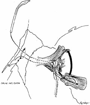 RECONSTRUCTION OF THE LACRIMAL DRAINAGE SYSTEM AFTER TUMOR EXCISION Lid tumors involving the punctum or canaliculus require careful excision under meticulous frozen section control or Mohs-type excision. However, a lid defect with a remaining proximal portion of the canaliculus can be repaired with a Silastic stent in a fashion similar to that described for canalicular lacerations (Figs. 62, 63, 64). Silastic tubing is passed through the normal punctum and canaliculus and brought out through the nasolacrimal duct. The other end, with the probe attached, is threaded into the remaining canalicular remnant. The lid is sutured into position, leaving a loop of Silastic that will form a pathway from the palpebral surface to the mucosa of the canaliculus. The tubing loop must be relatively loose to minimize the greater chances of cheesewiring that are present here.