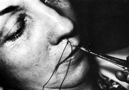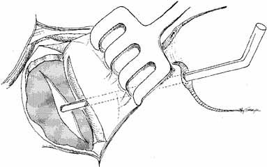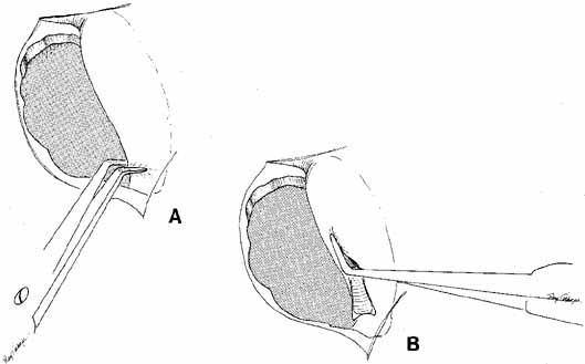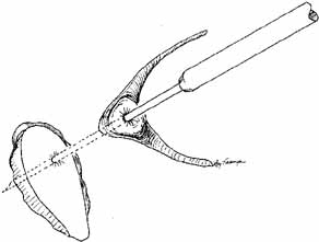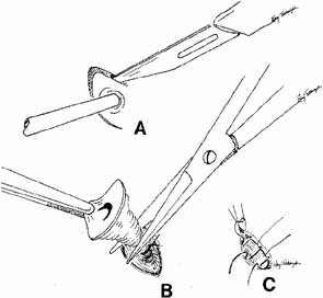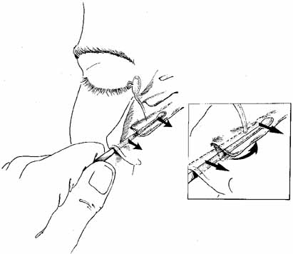 As for the monocanalicular stents, our preference is to use the Ritleng probe for passage. This hollow probe has a directed groove at the distal tip (Fig. 25A and 25B). The prolene portion on the Silastic tubing is fed down the probe and recovered from the nose (Fig. 26). Sometimes the directional groove will lead the prolene portion directly out the nostril. It is helpful to feed a majority of the prolene down the probe to facilitate distal recovery. The Ritleng hook, Crawford hook, or myringotomy forceps can be utilized to retrieve the prolene portion from the nose. If any trouble is encountered retrieving the prolene feeder, the surgeon should feel for the Ritleng probe and hook it. Once the hook is around the probe, the probe should be rotated 180 degrees because this will position the distal opening of the probe posteriorly. In addition, the probe should be slightly withdrawn. The hook will engage the prolene feeder when the hook is pulled anteriorly. It is important to note that the prolene thread has two portions, a light blue section and a dark blue section. The darker portion has a thicker diameter. When all the dark prolene has been inserted down the probe, the light blue, thinner portion should be passed outside the slit on the side of the probe. Simultaneously, the probe should be removed proximally from the nasolacrimal system.