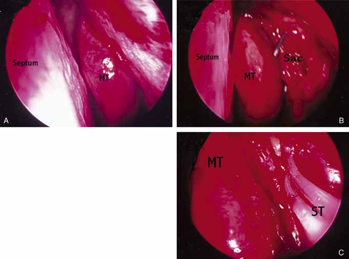 The endoscopic approach is useful in patients who need revision of DCR. The nasal ostium is easily identified and work is accomplished in a retrograde fashion. The ostium can easily be expanded with functional endoscopic sinus surgery instruments or a rongeur. Debris obstructing the fistula can also be identified and removed (Fig. 49).
