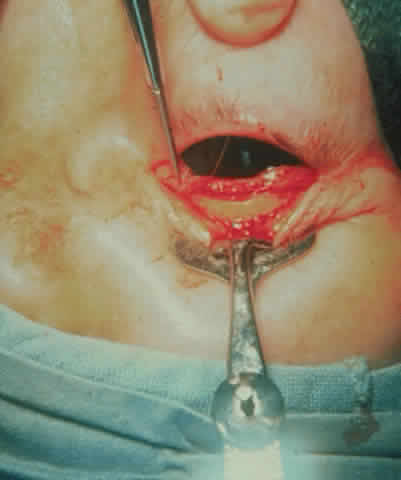 The tarsorrhaphy complications are usually failure of the lid adhesion or a stretching of the lid adhesion. Misdirection of the lashes can occur after a tarsorrhaphy. There are seldom major complications such as hemorrhage or infection. There are many techniques available for tarsorrhaphy. The following approach is effective in creating a permanent tarsorrhaphy that can be reversed later if desired. First, the lids are infiltrated with local anesthetic containing epinephrine at 1:100,000 dilution. The lateral portions of the upper and lower lids are brought together to assess the amount of horizontal fissure narrowing needed. If the patient has significant lagophthalmos, he can be asked to gently close the eyes while the lids are being held together to determine if the proposed tarsorrhaphy will ensure full closure of the eye. A protective corneal lens may be placed on the eye at this time. The lids are then split into anterior and posterior lamellae at the gray line to a depth of approximately 1 mm. This incision extends from the lateral canthus to the nasal-most portion of the lid that is to be closed. The marginal tissue on the posterior side of this incision is then excised. The posterior lamella is closed with three or four interrupted 5-0 Vicryl sutures, with the knots tied anteriorly. The sutures should be placed so they are not penetrating through to the conjunctival surface. Following this, the skin edges are everted and the lids sutured together with 6-0 suture. If there is significant tension in the lids, a temporary Frost suture may be placed and removed in a week. |