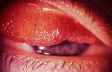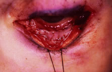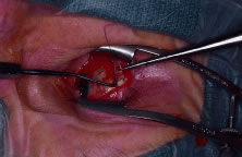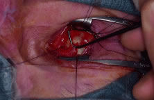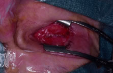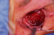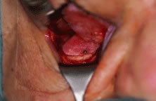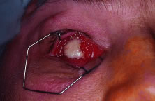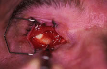 With the increasing use of vascularized, porous, integrated, orbital implants, the risk of implant extrusion is decreasing. However, implant exposure resulting from conjunctival defects overlying the newer porous implants is more common than extrusion. These complications are often seen in the early postoperative period or more uncommonly years after enucleation or evisceration surgery. Typically, conjunctival defects with small areas of exposed polyethylene or HA are noted. The patients may complain of increased socket discharge or pain. Conjunctival defects may be related to poor prosthesis fit, excessive socket manipulation, poor surgical technique, the rough surface of the implant, poor vascularization of the implant, or unknown causes. Patients with a conjunctival defect are at increased risk of orbital infection. Correction of the problem can sometimes be accomplished by elevating conjunctiva and Tenon's capsule from the implant, freshening the edges, and closing in a layered fashion. More commonly, the conjunctival edges must be elevated from the implant and sutured to a piece of graft material such as sclera, dermis, or fascia. With time, the conjunctival epithelium grows over the graft material and seals the defect. I have had good success in repairing conjunctival defects over vascularized implants using a patch graft of buccal mucous membrane (Fig. 24). An appropriately sized graft is harvested from the mouth, and the conjunctival edges are sutured to the graft with interrupted absorbable sutures. Vascularized flaps from the eyelid can also be used to repair larger defects.39 Significant defects and conjunctival shortening may necessitates implant removal and replacement with a dermis fat graft. After surgical treatment, consultation with the ocularist is essential to ensure a proper prosthesis fit.