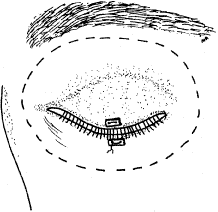 tissue, and skin. INDICATIONS Most commonly, exenteration is performed in cases of life-threatening malignancy in an attempt to prolong life and decrease morbidity.5,40 Tumors extending secondarily from the adjacent sinuses, cranium, face, globe, conjunctiva, and eyelids account for approximately 75% of the cases requiring exenteration in an extensive review at Duke University.25 Squamous cell carcinoma, basal cell carcinoma, and melanoma are the most common orbital tumors requiring exenteration. Primary orbital tumors such as vascular malformations, primary lacrimal gland tumors, and meningiomas are less common causes of exenteration. Orbital exenteration is often required in cases of extensive rhino-orbital phycomycosis in conjunction with systemic antifungal therapy and hyperbaric oxygen. Wide surgical debridement is required in the treatment of mucormycosis; however, some reports have shown positive results without extensive exenteration.41 Less commonly, orbital exenteration is performed to in cases of severe orbital pain or deformity. SURGICAL PROCEDURE Patients with life-threatening malignancies or infections are typically under the care of a team of physicians at the time of exenteration. A complete systemic evaluation is required before surgery to establish the extent of the disease process and to determine the patient's prognosis following any surgical and/or medical treatment. Preoperative imaging should also be performed to help identify the extent of the orbital involvement and to aid in surgical planning. Obvious extension outside the orbit mandates the need for surgical consultation with a Mohs' surgeon, head and neck surgeon, or neurosurgeon. Often in cases of secondary orbital tumors, an interdisciplinary surgical approach is required. Consultation with a tumor board often proves valuable in formulating an overall treatment plan for the patient. Some tumors benefit from preoperative chemotherapy, whereas others require postoperative radiation therapy. In cases in which extensive systemic disease is found, a major disfiguring surgery might be contraindicated and palliative care might be undertaken instead. A definitive tissue diagnosis using permanent histopathology material is always required before exenteration. After general anesthesia is induced, an initial incision line is marked just inside the orbital rim. Intravenous broad-spectrum antibiotics are given. The area is infiltrated with local anesthesia with 1:100,000 unit of epinephrine injected subcutaneously. A 4-0 silk suture placed through the eyelid margin is used to close the eyelids and provide a means of traction during the procedure. An incision is then made using a no. 15 blade through skin and into superficial orbicularis muscle fibers along the previously marked incision line (Fig. 25). The dissection is then continued in the suborbicularis plane using scissors or unipolar cautery to the bony orbital rim. If possible, the septum should be left intact. The periosteum is then cut just outside the orbital rim around the entire orbit. The periosteum is dissected from the orbital rim and elevated along the orbital walls towards the apex using a Freer periosteal elevator. Adequate suction and a headlight are essential for proper visualization. The zygomaticofacial and zygomaticotemporal neurovascular bundles along the lateral orbital wall are cauterized and cut. The periorbita elevates easily from most surfaces of the orbit. Firm attachments are seen at the lateral orbital tubercle, the trochlea, and in the inferomedial orbit near the nasolacrimal duct and inferior oblique muscle attachment. When the inferior and superior orbital fissures are encountered, incremental cautery followed by cutting with large scissors facilitates the dissection and decreases bleeding. Care must be taken when dissecting the periorbita from the medial orbital wall to prevent breaking the bone. Penetration into the sinuses may result in the formation of sino-orbital fistulas. After the periorbita has been elevated to the apex, the apical stump is transected using enucleation or Metzenbaum scissors. The specimen is removed; cottonoids soaked in dilute epinephrine, Afrin, or thrombin are placed over the remaining orbital tissue; and the socket is firmly packed with 4- × 4-in. gauze sponges. After 5 minutes, the packing is removed and hemostasis is achieved with bipolar cautery to the stump. Inspection of the orbit is then performed for any evidence of abnormal tissue. Frozen section monitoring should be used to ensure complete resection in areas where the tumor approaches the surgical margins. Extension into the cranial vault or sinuses requires the expertise of a neurosurgeon and head and neck surgeon to ensure adequate removal of tumor.