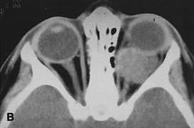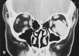 HISTORY AND PHYSICAL EXAMINATION A wide range of signs and symptoms may alert the ophthalmologist to involvement of the orbit by a pathologic process. These include proptosis or globe displacement; compressive optic neuropathy with visual field or visual acuity loss; refractive changes such as progressive hyperopia, restricted eye movements, and diplopia; optic disc changes, including pallor or edema; and fundus changes such as choroidal folds. These manifestations may be the consequences of a primary intraorbital disease or may occur secondary to involvement of the orbit by a process extending from the overlying soft tissues, periorbital sinuses, or intracranial cavity. All patients with suspected orbital pathology should have a thorough ophthalmic history and physical examination. Detailed questioning about the nature, onset, and progression of the chief complaint is necessary to formulate a differential diagnosis. Previous ocular and general medical history related to diseases, operations, medications, and family history should be obtained. A general review of systems will identify risk factors for related systemic diseases, such as hyperthyroidism, metastatic cancer, or lymphoma. A complete examination of the eye and periocular tissues is essential. Abnormal protrusion or displacement of the globe, extraocular motility disturbances, soft-tissue changes, and decreased corneal or periorbital cutaneous sensation should be specifically sought. Special attention always should be directed to evaluation of optic nerve function. Visual acuity testing alone is not sufficient because visual acuity often is preserved initially in patients with compressive optic neuropathy. All patients should be examined closely for detection of an afferent pupillary defect, abnormal color vision, or loss of contrast sensitivity. Formal perimetry should be performed to rule out peripheral field loss. If the presentation has been gradual, evaluation of old photographs may help establish the time course of the pathologic process. In selected cases, appropriate blood work to help identify orbital inflammatory or neoplastic processes also should be obtained. ORBITAL IMAGING Valuable information about the nature and extent of an orbital pathologic process is provided by imaging studies such as computed tomography (CT) scan, magnetic resonance imaging (MRI), and orbital echography. Better spatial resolution, ready accessibility, and lower cost make CT the preferred choice for orbital imaging in most cases. Orbital fat provides a natural contrast between most adjacent orbital structures on CT scanning, and orbital bones are visualized well. Computed tomography is essential for evaluation of the orbital bones because they cannot be imaged with MRI. Direct coronal or sagittal images are important to identify the relationship of a lesion to the optic nerve so that the surgical approach can be planned to avoid traversing the optic nerve (Fig. 1). Newer multislice helical CT scanners allow continuous acquisition of data so that a single rapid pass allows formatting in axial, coronal, and sagittal planes. Multislice CT provides shorter examination times with reduced motion artifact and radiation exposure when compared with conventional CT. Magnetic resonance imaging is useful in selected cases, especially when evaluating the orbital cranial junction. Significant bony artifact and a lack of orbital fat in the orbital apex make CT scan resolution of the orbital apex structures poor. Because cortical bone has low signal on MRI, there is no bone artifact when viewing the orbital apex on MRI. The lack of intervening fat in the apex to provide contrast is overcome on MRI because contrast is provided by the individual nuclear characteristics of each tissue so that the orbital apex structures are visualized well. Consequently, conditions that affect the optic nerve and chiasm, such as optic nerve meningioma and glioma, generally are evaluated with MRI rather than CT scan (Fig. 2). Use of a contrast agent such as gadolinium can further enhance the T1 signal intensity of lesions and is particularly helpful in imaging areas where there has been a breakdown in the blood–brain barrier. Because orbital fat produces a bright signal on T1-weighted images, orbital MR usually is performed with “fat suppression” to prevent masking of lesions. However, incomplete fat suppression can produce artifacts that may be misinterpreted as abnormal enhancement. A few other orbital conditions are better visualized with MRI than CT scanning.1–3 Often, organic foreign bodies, such as wood, are not imaged well with CT scan. These foreign bodies often are visible with MRI. However, care must be taken when imaging any metallic intraocular or intraorbital foreign body because the strong magnetic field of the MR scanner may cause the foreign body to shift position and damage surrounding structures. In some tumors and vascular anomalies, high blood flow is appreciated on MRI. This is caused by a lack of signal, known as a flow void, created by blood flowing rapidly through larger vessels. Tumors that originate in the brain and extend into the orbit secondarily, such as sphenoid wing meningioma, also are visualized well with MRI. However, bony detail and calcification within the meningioma are not imaged well. In unusual circumstances such as this, CT scan and MRI may prove to be complementary, and both techniques may be required to fully evaluate the orbital disease process. Orbital echography can provide useful information in the evaluation of orbital disorders. Because each tissue has its own acoustic characteristics, echography can provide a high degree of tissue contrast. Spatial resolution also is quite good. In some situations, echography can provide information not available on CT scan or MRI. These instances include detection and measurement of blood flow4 and intraoperative localization of small foreign bodies.5 Orbital echography requires speci