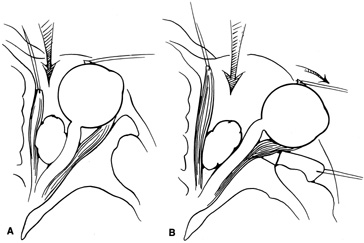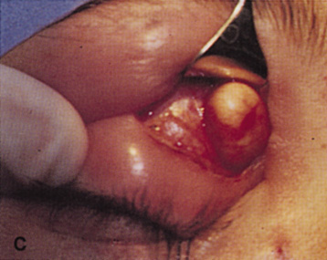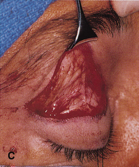 The lateral rim may be left in place and dissection carried out anterior to its posterior recess at the lateral canthus (see Fig. 29B). Because the lateral rim recesses posteriorly at the canthus, the posterior surface of the globe and anterior retrobulbar space usually are accessible. If exposure is limited, the lateral rim can be partially thinned with a bone burr until there is ready access to the retrobulbar space. Sharp dissection through the intermuscular septum allows entry into the retrobulbar intraconal space (see Fig. 29C). Closure is accomplished by simply reapproximating the superior and inferior crura of the lateral canthal tendon and closing the canthotomy skin incision. INDICATIONS Anterior peripheral and intraconal lesions and the lateral retrobulbar optic nerve can be readily approached with this technique. There is no need for disinsertion of the lateral rectus muscle because its belly can be retracted out of the field. |