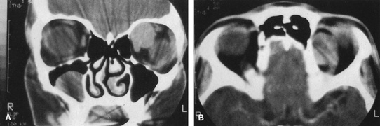 The periosteum is exposed and incised with a Freer elevator and then is reflected off the bone posteriorly. It is generally quite adherent to the curved contour of the medial canthal bones, especially at the medial canthal tendon. The anterior lacrimal crest is encountered inferiorly. Care should be taken not to damage the lacrimal sac with the elevator. The posterior lacrimal crest is visible behind the sac. Adequate mobilization of the periosteal connections to the anterior lacrimal crest gives a large area of exposure. The periosteal elevation is carried superiorly in the area of the trochlea. Elevation of the periosteum opens the subperiosteal space. Blood or pus caused by fracture or infection, if present in this space, is encountered at this point. Elevation of the periorbita along the medial orbital wall posterior to the lacrimal sac progresses easily. Orbital fractures involving the thin ethmoid bone are seen at this point. The anterior ethmoidal artery is seen at the junction of the ethmoidal and frontal bones where the orbital roof meets the medial orbital wall (see Fig. 7). Usually it is found on a line extending posteriorly from the superior border of the medial canthal tendon. This artery either should be thoroughly cauterized with the bipolar cautery or clipped with a vascular clip before cutting. As the dissection in the subperiosteal space moves posteriorly, the orbit narrows. The posterior ethmoidal artery is identified. This is a reliable landmark for the optic foramen, which lies approximately 5 mm behind the ethmoidal artery. Indications The frontoethmoidal medial orbitotomy allows access for a variety of procedures in the subperiosteal and peripheral surgical spaces and sinuses (Fig. 17). Its main use is for processes involving both the frontal or ethmoid sinuses and the orbit. Entrance into the subperiosteal space is obtained easily. Drainage of subperiosteal blood or pus occurs as the space is entered.