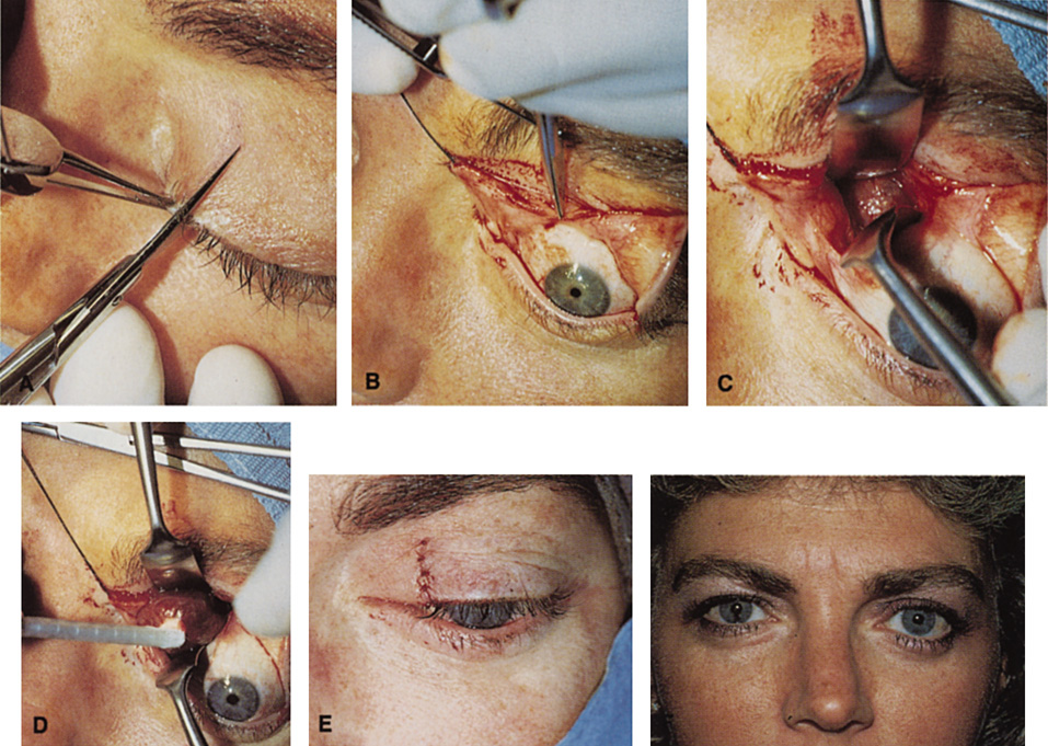 rectus muscle.27 PROCEDURE A 1- to 1.5-cm lateral canthotomy incision is made, and dissection with unipolar cautery is carried down to the lateral rim (Fig. 29A). Periosteum is incised along the long axis of the lateral rim from superior to inferior and elevated from the lateral orbital rim. The periorbita is then elevated from the inner aspect of the lateral orbital rim, and a longitudinal incision from anterior to posterior is made in the periorbita paralleling the underlying lateral rectus muscle.