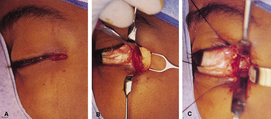After removal of the lesion, repair is carried out in a fashion identical to that used for repair of a lid marginal laceration. The bulbar, fornix, and palpebral conjunctiva are reapproximated and the tarsal plate meticulously realigned at the lid margin with a vertical mattress 7-0 Vicryl suture. Additional sutures to realign the lash line are followed by closure of the orbicularis and skin. Indications This approach allows for excellent scar camouflage with maintenance of appropriate lid height and contour. It is useful for exposure of superior orbital lesions that lie medial to the optic nerve (see Fig. 26G, H). Well-encapsulated peripheral and intraconal lesions posterior to the globe may be reached fairly readily with this approach. |