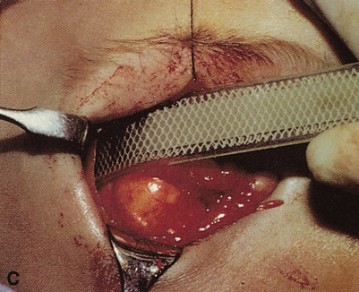 Indications The most common use of the transconjunctival orbitotomy is to expose the anterior portion of the peripheral extraocular muscle and intraconal spaces. In particular, the optic nerve can be biopsied or fenestrated by use of this approach. When exposure is too limited to safely biopsy deep intraconal masses, transconjunctival orbitotomy can be combined with a lateral orbitotomy with bone removal. This allows the eye to be shifted laterally, making more room to work in the medial orbit (see Fig. 27B). The transconjunctival medial orbitotomy can be extended vertically into the upper lid, as mentioned, to provide exposure of the superonasal quadrant FRONTOETHMOIDAL MEDIAL ORBITOTOMY A frontoethmoidal incision or transcaruncular incision can be used to enter the anteromedial extraperiosteal space without performing bone removal along the medial wall. These approaches are discussed under Deep Medial Orbitotomy. |
