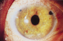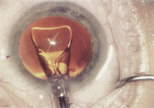 Rotation of Toric Plate Haptic Silicone Intraocular Lens Plate haptic toric IOLs produced by STAAR Surgical are 11.2 mm long for powers of 22.00 D and lower. The remainder are 10.8 mm long. The day after surgery, 90% of plate haptic toric IOLs are in good position relative to the axis marked with the patient upright before surgery. Up to 10% of them have rotated enough so that their power may be affected. Only rotations of 20 degrees or more are repositioned, usually 1 week after surgery to allow some capsular reaction to take place, reducing the risk of rerotation. A 10-degree rotation reduces effective astigmatic correction by 25%, and, in a worst-case scenario, a 90-degree rotation increases astigmatism. To achieve appropriate correction, these IOLs need to have their position adjusted. Rotation may be lessened by the newer 10.8-mm diameter (up from 10.5 mm). They are available in 2.00 D and 3.50 D models, which can correct approximately 1.50 D and 2.50 D of refractive cylinder. Alcon's single-piece toric model has been shown to exhibit very little rotation.221 (Fig. 84). Pupillary Capture After normal intraocular pressure is obtained, most clear corneal incisions will eventually show signs of leakage at surgery, if they are observed long enough. A very rare patient may experience an incision leak in the hours or days after surgery significant enough to shallow the AC. This may be the result of incision imperfection or a blow to the eye. If the pupil is still dilated, it will be possible to capture the optic partially or completely. Pupillary capture implies anterior capsulorrhexis capture. Also, it would be impossible to capture the optic by the pupil unless it had escaped the capsular bag. Patients with plate haptic lenses, regardless of the status of the incision or AC depth, will have to return to sterile conditions to have their IOLs placed back within the capsular bag. For patients with C-loop haptics, if the incision is still seen to be leaking with accompanying low intraocular pressure and shallow chamber, a return to sterile conditions will be required so that the incision can be closed and the IOL repositioned. In patients in whom the incision is no longer leaking, with normal IOP and a normal depth AC, pupillary dilation and then constriction after the IOL has fallen posterior may allow appropriate pharmacologic repositioning. The IOL will still be captured within the capsulorrhexis opening, but that should be of little consequence. Substantial changes to the iris and capsular bag architecture may occur if pupillary capture goes unnoticed for some time (Fig. 85). It is important to check the IOP and examine with the indirect ophthalmoscope because a shallow chamber may be produced by choroidal effusion or suprachoroidal hemorrhage immediately after surgery. Anterior Position of Crystalens™ Atropine is given after surgery to make sure that the optic is flexed posteriorly against the posterior capsule. An anterior position, which would change functional IOL power and pseudoaccommodative performance, could occur with postoperative wound leakage and chamber shallowing. Because of this, Dr. Cumming recommends the use of a scleral tunnel incision with the Crystalens™. He also recommends the SRK/T formula for axial lengths of 22.0 mm or longer and the Holladay II formula for shorter eyes.156 Capsular Bag Distention/Capsular Block Syndrome Capsular bag distention syndrome may have several different causes. Usually seen several days to weeks after surgery, it is characterized by a distended capsular bag with the IOL optic pushed forward slightly, usually creating a low-grade myopia (Fig. 86). It has been thought that trapped viscoelastic material could trigger this phenomenon. Micropipette studies have demonstrated residual viscoelastic within the capsular bag.222 Protein production by residual epithelial cells has also been mentioned as a possible cause. Distention can be created during the final intraocular pressure adjustment and stromal hydration incision sealing procedure. Finally, a bench test model experiment has demonstrated that fluid from the AC can be pushed back behind the IOL into the intracapsular space by saccadic eye movements.223 Treatment can be accomplished with a single 1.6-mJ shot from the YAG laser, making a small opening in the peripheral anterior capsule that allows egress of the trapped fluid. Pigment Dispersion and Uveitis, Glaucoma, Hyphema Syndrome This was a more common problem in the days of ciliary sulcus placement and asymmetric placement. It could occur with both posterior and AC IOLs.220,224 It can still be observed in capsular bag placement especially in cases of zonular laxity (e.g., pseudoexfoliation). In these cases, there can be substantial iridopseudophakodonesis, which may lead to transillumination defects in the shape of the haptics (Fig. 87). Deposition of pigment occurs in the angle over the trabecular meshwork and may be associated with increased intraocular pressure. Observation of pressure and optic nerve head anatomy should be conducted regularly because the outflow channels in patients with pseudoexfoliation may have been compromised previously. Because of the iridophakodonesis, intermittent bleeding and episodes of uveitis may also be noted independent of increased pressure, and IOL exchange may be necessary. There are several reports of such complication after implantation of both single- and three-piece Acrysof® IOLs into the ciliary sulcus.225,226 The AMO Sensar with a rounded anterior edge should be better for sulcus implantation of acrylic IOLs. Post-Nd:YAG Dislocation Nd:YAG laser capsulotomy has been performed in X, cross, triangular, and circular patterns. When using one of the linear patterns, the posterior capsular opening could extend to the capsular bag equator. Because plate haptic silicone IOLs are weakly held in place by capsular fibrosis, some of these were found to dislocate into the vitreous cavity after Nd:YAG