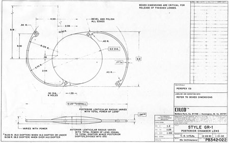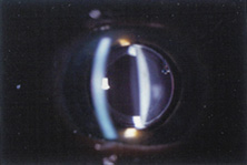 Sinskey's phacoemulsification technique was basically one-handed and allowed a more generous anterior capsular remnant to exist after nucleus removal. Symmetric capsular bag fixation was possible a fair amount of the time. Optic posterior angulation was incorporated in his lens to prevent pupillary capture, which was still possible. The concept of intracapsular phacoemulsification and the desire to fixate the IOL within the capsular bag ultimately led to the second type of posterior chamber IOL, the minimally compression-resistant, short haptic configuration created for capsular bag fixation that exists today.19 The third style was a transitional lens that was oversized and was to be used with planned ECCE. It eventually measured 14 mm in haptic diameter and 7 mm in optic diameter. It was large and stiff in its eventual one-piece design. The problem was that after ECCE, the capsular bag did not exist in a structural sense. With broad contact, at least one haptic would be captured by some partially unrolled capsular flap remnant, usually the inferior. If it were asymmetrically placed, which was the expectation, the lens was so long that capsular fibrosis would not decenter the very large optic too much because of the contact created in the superior ciliary sulcus by the high resistance to compression. Because of their large size, these lenses were very difficult to place symmetrically within the capsular bag but are still in use today as ciliary sulcus placed secondary IOLs in patients with very large eyes. As an aside, glass IOLs were marketed for a short period. Even in aqueous, they were heavier than plastic. Glass also broke if hit by the neodymium:yttrium-aluminum-garnet (Nd:YAG) laser (Fig. 12).20 Plastic IOLs inadvertently hit by the YAG laser during capsulotomy developed small cracks or pits that did not affect vision and did not completely fracture. Glass was eventually abandoned because of its weight and YAG intolerability. The right to use polyamide framing and haptic material was purchased from Lynell Optics by STAAR Surgical (Monrovia, CA) and is in use today by that company as a haptic material combined with silicone optics. ENDOTHELIAL CELL DAMAGE, VISCOELASTICS, ANTERIOR CAPSULAR TEARS, AND SUTURELESS CLOSURE With the introduction of clinical corneal endothelial photography 1976, Bourne and Kaufman heightened our awareness of quantitative and qualitative endothelial damage associated with IOLs.21 In 1980, Miller and Stegmann, working with the Pharmacia Company of Uppsala, Sweden, introduced the first viscoelastic, 1% sodium hyaluronate (Healon).22,23 This not only protected the corneal endothelium during IOL implantation but also made anterior capsulotomy much easier to perform. The control of the anterior capsular surface with viscoelastic, pushing it back and making it flat, was an important aid in the prevention of unwanted ARTs during the can-opener capsulotomy process. The number of central corneal endothelial cells after IOL implantation decrease at rates greater than those of healthy unoperated corneas24–29 (normal loss ranged from 0.3% to 1.0% per year). The only randomized trial of lens implantation, the Oxford Cataract Treatment and Evaluation Team found a higher rate cell loss in eyes with implants than those without in the first 3 postoperative years.30 Unfortunately the type of surgical technique and IOLs (ICCE and Binkhorst 4-loop lens) are no longer being used. A 5-year prospective study from the Mayo Clinic31 reported 23% to 28% of endothelial cell loss after cataract surgery over the 5-year postoperative period. The rate of cell loss was not found to be influenced by the surgical technique (ICCE vs. ECCE), implantation of an IOL, and type of IOL implanted (medallion iris suture IOL, transiridectomy clip implant, or posterior chamber IOL). Correlation was found between the endothelial trauma judged at surgery and the long-term endothelial cell loss. Extension of the follow-up time to 10 years32 demonstrated that the eyes continued to lose endothelial cells from the central cornea at an average rate of 2.5% per year (2.5–8.0 times the rate in healthy unoperated eyes); also in this study the type of IOL implanted did not influence the rate of cell loss. These studies had two major caveats: (a) A significant percentage of patients were lost to follow-up. (b) The study represents the early cases in the implant experience of the surgeons (1976–1982) and do not represent the currently surgical technique and IOL technology. In the early days of the phacoemulsification the corneal cell loss rate was high because of the long phaco time and high energy that were commonly used. In recent years, damage to corneal endothelial cells during cataract extraction has been minimized as a result of better instrumentation,33 newer viscoelastic materials,34,35 and improved surgical technique such as phaco chop,36 which aims to reduce machine measured phaco time. Several preoperative and intraoperative parameters can influence the risk for endothelial cell loss after phacoemulsification. A high nucleus grade,37 old age, long phaco time,38 and short axial length39 are associated with an increased risk for endothelial cell damage. Ravalico and coauthors40 reported that AC IOLs implantation did not appear to alter corneal endothelial function over 5.2 years of postoperative follow-up period. As a summary, it seems that the endothelial cell loss after cataract surgery is related to the surgical trauma and maybe to the absence of the crystalline lens but not to the IOL implantation. Surgeons who performed one-handed phacoemulsification were preserving the capsular bag better than two-handers. In 1981, John Graether,41 a left-handed one-hander, designed the first one-piece all-PMMA IOL that was 12.25 mm in overall length designed specifically for implantation in the capsular bag (Fig. 13). He had invented a “collar button” retractor and described a way to use it by pushing on