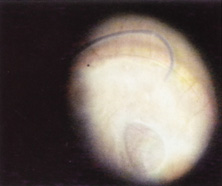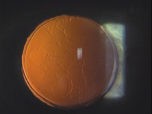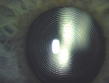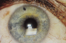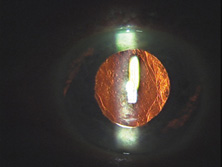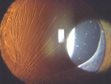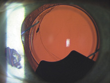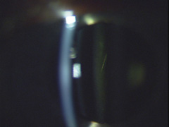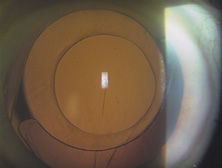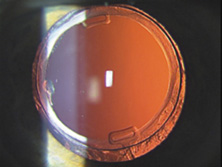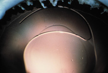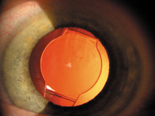 The incidence of substantial positive and negative dysphotopsia with the single-piece AcrySof® design is very low and the frequency of IOL exchange required is even lower. In J.A.D.'s series of 7234 consecutive single-piece AcrySof® IOLs from April 2001 to December 2004, the following was recorded prospectively: positive dysphotopsia, 11 cases (0.15205%); negative dysphotopsia, 26 cases (0.35941%); total dysphotopsia, 39 cases (0.53912%). Nine IOL exchanges for dysphotopsia (four positive and five negative) were accomplished (0.12%) cases. All cases were exchanged with AMO SI40s. Of those with positive dysphotopsia, three patients had symptoms improve, and one patient experienced no relief. Of those with negative dysphotopsia, three patients had symptoms totally resolve, and two patients had only improvements. Of the seven patients with bilateral surgery, five had AcrySof® IOLs implanted in their fellow eye with no dysphotopsia symptoms. There were no patients with an IOL exchange who had bilateral symptoms. During that time one Clariflex IOL was exchanged for negative dysphotopsia and one AMO AR40E was exchanged for positive dysphotopsia. AMO engineers created a round-edge acrylic foldable design, the AR40. This IOL performed well but was eventually found to have a higher incidence of PCO.260 Aware of the attributes and problems associated with the square edge, AMO engineers created a modification so that only the intuitively critical posterior edge would be square but the middle and anterior portions would be rounded (the OptiEdge™) (Fig. 99) to reduce the ability to create reflections. This IOL, the AR40E, has been found to produce negative dysphotopsia (peripheral dark shadows) in approximately 1% of patients.260 Confident in their design, AMO engineers adapted this compound edge to their silicone optic product, producing the Clariflex IOL. This IOL is not free of dysphotopsia; the only Clariflex J.A.D. ever implanted had to be exchanged (Fig. 79) because of the perception of a temporal and inferior dark arc-like shadow. An SI40 resolved the problem. Pharmacia's engineers wanted to recruit the apparent advantage of the square-edge design also, and it was incorporated into several models including the Technis IOL. Because of the lower index of refraction, these optics are thicker and have thicker edges, for example, 0.6 mm in the case of the Technis IOL. Peripheral dark shadows are also visible in approximately the same proportion of patients when using the Technis IOL as well. Although the problems with dysphotopsia are rare, they are extremely troublesome for some patients. Because of this some surgeons have continued or renewed their interest in round-edged silicone IOLs such as the three-piece design SI40 or the STAAR plate haptic design AA4203. But even round-edge silicone IOLs can produce dysphotic symptoms in predisposed patients.260 Round-edge silicone IOLs, three-piece or plate haptic, are good choices for most patients just as are square-edge acrylics. There is a balance of risks of problems associated with each; increased inflammatory sequelae and PCO with one style versus pseudophakic dysphotopsia with the other. It is preferred to consider implantation of a round-edge IOL in patients under two circumstances. First, some patients reveal a lifetime history of glare (day and/or night) and/or night driving difficulty because of headlight glare. It is likely that they will be more prone to the same glare symptoms after surgery as well as being more prone to pseudophakic dysphotopsia. This would be particularly true if patients have corneal endothelial dystrophy. Second, this style optic may perform better if patients have as their subjective chief symptom blur and glare symptoms out of proportion to their objective cataract appearance, even in the absence of a lifetime glare history. Consideration for the rounded-edge IOL is even greater if moderate corneal guttata are present. Most patients adapt to the dysphotopsia and find that it resolves for the most part within a few months. This may be from adaptation, fatigue, or capsular fibrosis.257 Sometimes posterior capsular striae are present, but they have not been found to affect vision.264 Rarely, the phenomena are so disturbing that IOL exchange for an IOL made of another material may be required. This usually but not always solves the problem. Although rarely seen with improved design acrylics, if positive pseudophakic dysphotopsia symptoms are substantial, an IOL exchange can be contemplated within 1 or 2 weeks or after surgery because these symptoms will not improve enough to satisfy a patient with time. If negative pseudophakic dysphotopsia symptoms are still bothersome after 2 months, an IOL exchange should be contemplated (Fig. 100). In rare cases, Alphagan P has provided some varying relief in symptoms while waiting for definitive improvement in positive or negative dysphotopsia symptoms. Nd:YAG laser treatment does not resolve this symptom and makes IOL exchange more difficult if it is found to be necessary. Nd:YAG laser posterior capsulotomy has occasionally brought relief to the patient who sees a line of light that seems to be at right angles to a very prominent fold or folds in the posterior capsule intuitively creating a kind of Maddox rod-type effect (Fig. 101). The edge and anterior surface reflection theories are probably both correct; positive dysphotopsia is predominantly caused by anterior surface reflections, and negative dysphotopsia is predominantly caused by edge reflections. Perhaps some reflection from the corneal endothelial surface is involved. Maybe light is just missing the optic and passing between the space between the anterior optic surface and the posterior iris and shining on the retina creating an obscuration or shadow. As of 2004, the exact cause of dysphotopsia is unknown, but the varying circumstances make understanding difficult: Dysphotopsia occurs only in eyes requiring normal to 