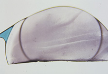 Ridley had been inspired by the tolerance of British fighter pilots' eyes to plastic fragments, which had lodged in them after their canopies, made of polymethylmethacrylate (PMMA; Perspex), had shattered. He worked with the Rayner Company and Imperial Chemical Industries, both in Great Britain, to develop Perspex CQ, a more purified “clinical-quality” PMMA. He used the human lens as his model and selected similar radii of curvature to create a biconvex disc while using approximately half the thickness and weight (∼5 mm thick and 230 mg for the human lens). One of his original lenses made by Rayner, a 23.00 diopter (D), was measured at 8.5 mm in diameter and 2.4 mm thick, with a weight of 108 g. Modern analysis has demonstrated that this IOL passes modern optical bench examinations10 (Fig. 2).