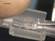 Ridley's achievements were finally and belatedly celebrated in numerous tributes. His first and perhaps most-prized honor was his election to the Royal Society in 1986. Dr. Apple presented him his first University Doctorate at the Medical University of South Carolina in 1988. He received another honor at the Science Museum in London on November 29, 1999, the 50th anniversary of the first part of the first IOL implantation. In the Flight Room, with airplanes suspended overhead, Ridley was honored by fellow pioneers and colleagues from around the world, as well as by the Rayner Corporation and government representatives from the United Kingdom and United States. The same year, the American Society of Cataract and Refractive Surgery (ASCRS) honored him as one of the 10 most influential ophthalmologists of the 20th century. In 1990, he was guest of honor at the Annual Meeting of the American Academy of Ophthalmology. In recognition of his unique efforts in IOL development and implantation, Ridley was knighted on February 9, 2000, by Queen Elizabeth II. On May 25, 2001, at the age of 94 years, Sir Harold died in Salisbury, England, after a cerebral hemorrhage. Because of the difficulty with posterior chamber IOL placement, pioneering surgeons would spend the next two decades trying to find a better place to fixate the IOL. The AC lens, pupil-fixated IOL, iris-fixated IOL, and iridocapsular IOL would be placed in large numbers, only to return to the posterior chamber in the 1970s. This made for very interesting surgical residencies during these times. We were always learning something completely new. For example, during J.A.D.'s 3-year residency starting in 1977 at the Mayo Clinic, we evolved through cryoextraction ICCE using no IOL, cryoextraction ICCE with Medallion iris-sutured IOLs, machine-assisted ECCE with iridocapsular fixation using metal and then plastic clips through the iridectomy, and machine-assisted ECCE with posterior chamber IOL implantation. ANTERIOR CHAMBER AND PUPIL-SUPPORTED LENSES Apple and associates have described in detail the evolution of the IOL, describing six generations. AC IOLs were generation two.12 The first AC IOL was implanted by Baron of France in 1952. This lens failed primarily because of excessive anterior vaulting, which caused contact with the corneal endothelium. Mr. Ridley's good friend and long-time defender, Peter Choyce, also of the United Kingdom, was one of the developers and certainly the greatest champion of the AC lens (Fig. 4). These lenses could be placed after ECCE or ICCE procedures. His models were very successful with his last models, the Mark VIII and Mark IX, used until the mid-1970s in the United States.