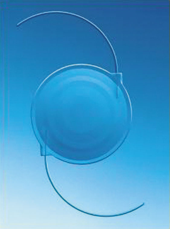 AC lenses had problems as well. Ellingson's uveitis, glaucoma, hyphema syndrome13 was associated with their use. Chronic irritation of the delicate structures of the angle caused this problem, and even without it, pain could sometimes be elicited by simply touching the eye. Later, similar rigid AC IOLs would have similar problems. Some had to do with sizing difficulties; others were problems of poor finish and the misapplication of polypropylene haptics in the AC, where they underwent ultraviolet (UV) degradation. Ultimately the flexible AC IOL was developed, most commonly the Kelman Multiflex (Fig. 5). This style of IOL features rather broad area smooth footplates, which can be placed in the angle without causing the chafe and erosion that small-sized loop-shaped haptic IOLs did. The Multiflex-type lens has provided excellent performance with similar and sometimes lower long-term corneal endothelial cell loss in secondary implantation than has the sutured ciliary sulcus posterior chamber IOL.14