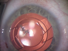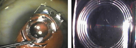 The ultrathin properties of the lens are attributable to its optical design. The optic features three to five concentric optical zones with steps of 50 μm. Each Fresnel-like ring or segment of the lens has a small change in the radius to correct for spherical aberration. The difference in radius is stated to ensure that each ring of the lens focuses light at nearly the same point as the prime meridian. According to the manufacturer, by making the lens thinner, other aberrations such as coma and the potential for distortion and glare are reduced. The four tips of the haptic component are very thin, measuring only 50 μm. They can roll once in the capsular bag, absorbing capsular contraction forces. The edge of the lens is also 50 μm thick, which is stated to reduce the potential for halos and glare. In the first clinical studies involving this lens design, many of the patients presented with better than expected near vision. It has been hypothesized that the thin nature of this design provides increased amplitude of pseudoaccommodation, which will be further investigated. One explanation could be that the thin lens is associated with increased depth of field. Another possibility is that the lens would move with the capsular bag during efforts for accommodation, because it is thin and light, and exerts little force against the equator. At first the UltraChoice™, also called the ThinLens, was folded manually. As of 2004, a roller/injector system with an autoclavable, reusable cartridge made of Teflon is available. Cadaver eye studies conducted in Dr. Apple's laboratory demonstrated excellent centration of the UltraChoice™ ThinLens IOL. Acri.Smart™ Another recently developed lens for insertion through very small incisions is the Acri.Smart™ lens (Acri.Tec GmbH, Berlin, Germany). This is a one-piece, plate, planar lens with an optical diameter of 5.5 mm and a total length of 11.0 mm (model 48S). The first Acri.Smart™ lens was rolled onto itself to create a prefolded lens that was shorter in diameter. A folded +19 D lens had a width of approximately 1.2 to 1.3 mm. During the minutes after implantation in the capsular bag, the Acri.Smart™ unfolded gradually, and was completely unfolded after 23 to 30 minutes. The more recent models of the Acri.Smart™ lens (model 48S with a 5.5-mm optic and model 46S with a 6.0-mm optic) have been developed for implantation with a specially designed injector through a 1.4- to 1.5-mm incision. These are hydrophilic acrylic (25% water content) lenses with a hydrophobic coating. The overall design is that of plate haptic lenses with square edges, which are loaded into the injector already in a hydrated state; thus the unfolding is faster. Model 36A, with a special aspherical design, has also been developed to compensate for the positive spherical aberration of the cornea, in a mechanism probably similar to that of the Tecnis® lens. SmartIOL™ Currently in laboratory study, a new concept of small-incision IOLs is being developed at Medennium Inc. (Irvine, CA), called the SmartIOL™. The SmartIOL™ uses a thermodynamic hydrophobic acrylic material that is packaged as a solid rod approximately 3.0 mm long and 2.0 mm wide. The refractive index of the hydrophobic (0% water) material is 1.47 and the glass transition temperature is 20°C to 30°C. When the lens is implanted through a small incision, body temperature transforms the solid into a soft gel-like material, which has the shape of a full-sized biconvex lens that completely fills the capsule. The entire transformation takes less than 30 seconds and results in a lens approximately 9.5 mm wide and 3.5 mm thick at the center, depending on dioptric power. The lens is highly flexible, more closely resembling a gel, and it recovers its full shape when not compressed. Before it forms into a rod, the precise dioptric power and dimensions that the transformed material will take upon thermal activation in each eye can potentially be imprinted. In addition to being implanted through a small incision, another potential advantage is to restore accommodation. By combining a full-sized optic with a very flexible material, Medennium scientists hope to be able to mimic the accommodative action of the young, natural lens and achieve a larger potential accommodation than other optical-mechanical designs, according to the classic Helmholtz theory. Also, complete filling of the capsular bag eliminates space for cell growth. The hydrophobic acrylic material of this lens exhibits high tackiness, which might promote its attachment to the capsular bag, further enhancing PCO prevention. A new design of this lens is being developed, which is a three-piece lens with PVDF haptics. This will probably eliminate potential problems related to the different diameters of the capsular bags in different eyes. ADJUSTABLE-POWER PSEUDOPHAKIC INTRAOCULAR LENSES Light-Adjustable Lens™ This IOL is under clinical study. Calhoun Vision (Pasadena, CA) is developing a three-piece silicone IOL with photosensitive silicone subunits that move within the lens on fine-tuning with a low-intensity beam of near-UV light (light-adjustable lens [LAL]) (Fig. 61). The refractive power of the lens can be adjusted noninvasively after implantation to give the patient a definitive refraction. This new technology is being studied to provide a potential way to adjust incorrect lens power noted after IOL implantation, a significant reason for explantation of modern foldable IOLs. The LAL is a foldable modified C haptic three-piece lens. The optic component is manufactured from a silicone material, poly(dimethyl siloxane), with a refractive index of 1.43. The optic rim of this lens has square truncated edges. The haptics are manufactured from PMMA. The optic lens material has an incorporated UV absorber to protect the retina from radiation in the 300 to 400 nm range. When the eye is healed 2 to 4 weeks after implantation, the refraction is measured and a low