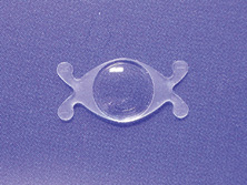 Two basic models are available. For partial iris damage, a ring with one black segment added to it can be implanted to cover the damaged area. For extensive iris damage, a multisegmented ring is available. One should always remember that other noninvasive solutions such as colored contact lenses and tattoos are possible. Ophtec (Groningen, The Netherlands) manufactures iris reconstruction implants as well. PSEUDOPHAKIC INTRAOCULAR LENSES FOR VERY SMALL INCISIONS The advent of microincision surgical techniques rendered cataract removal through clear corneal incisions as small as 1.1 to 1.6 mm possible. The natural consequence of this advance is the development of IOLs that can be inserted through such small incisions. UltraChoice™ ThinLens The UltraChoice™ ThinLens is not available in the United States. ThinOptX (Abingdon, VA) received CE Mark approval for the UltraChoice™ monofocal cataract lens on September 9, 2002. One of the recently developed lenses that can be inserted through a sub–2.0-mm incision (1.45-mm) is the UltraChoice 1.0 Rollable™ ThinLens (ThinOptX) lens (Fig. 60). It is manufactured from a hydrophilic acrylic material with 18% water content. The refractive index of the material is 1.47. The dioptric power of this lens ranges from +15 to +25 D, as of April 2003. The optical thickness is 300 to 450 μm, with a biconvex optical configuration having a meniscus shape. The overall diameter of the lens is 11.2 mm, and the optical diameter is 5.5 mm.