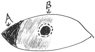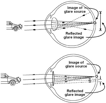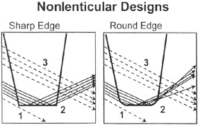 With most of the lenses, the onset of the opacification occurred from 6 months to years past the operation; the lens opacifications have occurred in only a handful of lenses. This has, unfortunately, at present served to give this material a poor reputation. Virtually all problems seen were based on faulty manufacturing, either at the time of formation of each company's polymer or during fabrication and packaging of the lens. For example, a hydrophilic acrylic material manufactured by Rayner Corporation has been implanted in approximately 1 million cases in 5 years with no report of primary calcification (data in file at Rayner Corporation). Pseudophakic Dysphotopsia The potential for flare, streaks, halos, shadows, and other abnormal visual perceptions239 in the pseudophakic patient (termed pseudophakic dysphotopsia (Olson RJ: IOL exchange to correct severe glare in 5.5 mm AcrySof patients. Presented at the Symposium on Cataract, IOL and Refractive Surgery, San Diego, CA, April 1998) have been present in every IOL design since Ridley's first implantation in 1949. The phenomenon is increased in incidence and severity by the use of small-diameter optics or truncated ovoid optics.60,240–245 Pseudophakic dysphotopsia is underdiagnosed because many patients will tolerate mild to moderate symptoms without ever saying much of anything about them. Other patients are more persistent in their willingness to articulate their experiences, which makes it easier to diagnose pseudophakic dysphotopsia. Some patients feel absolutely possessed by their visual distractions and find them virtually unbearable. If asked about them in a specific questionnaire, 20% of pseudophakic patients will report some type of abnormally imaged side effect.240 Although sometimes severe, these symptoms have usually been transient and clinically insignificant. However, these abnormal secondary perceptions attained contemporary interest because of their apparent increased incidence and severity in the very popular AcrySof® IOL.134,221,246–263This continues to be a reason for IOL exchange in a small but significant number of patients with this lens design and in patients implanted with similar designs as well. The dysphotopsia can be divided into “positive,” bright spots and streaks (Fig. 93),240 and “negative,” straight or slightly curved temporal dark shadows that appeared to be dark to the patient (Fig. 94).260 The combination of high refractive index hydrophobic acrylic material, square edge, and relatively flat anterior surface is especially prone to this complication. The square edge, which is a key feature in reducing central epithelial proliferation and resultant PCO, has been incriminated in a ray tracing analysis study. The internal reflection from the IOL edge diverts light rays to the opposite retinal field, casting a shadow where they otherwise would have struck the retina (Figs. 95 and 96).134 Other ray-tracing studies found that the relatively flat anterior surface of the high index refraction IOL may contribute to dysphotopsia.251,258An external light source at approximately 1 to 25 degrees to the optical axis can result in an internal surface reflection that is round or oval in shape and occurs with pupil sizes as small as 3.2 mm (Fig. 97). Alcon engineers responded with three key design modifications that were ultimately introduced in its single-piece models and later in its MA30AT and MA60AT three-piece models to improve optical performance. First, the power curves of the optics were reversed so that the relatively flat 5.5 D, which had defined the anterior surface, was placed on the posterior surface with the relatively more round dioptric power curve on the anterior surface. Second, the edge was modified in a proprietary process so that it was rendered antireflective (Fig. 98). And third, the edge was thinned to 0.22 mm from its immediately preceding 0.3 mm on the MA30AL and MA60AL (it was 0.4 mm thick at its introduction on the MA60AL) (personal communication, Alcon Surgical, November 2002).