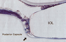 The hydrophilic acrylic IOLs (Hydroview, Bausch and Lomb) have shown the highest predilection for epithelial cell ingrowth, anterior optic precipitates,67 and formation of anterior surface white membranes in 33%.272 Surface deposits in pediatric patients have been reported to occur less frequently with PMMA IOLs treated with heparin surface modification versus untreated PMMA IOLs.273 Posterior Capsule Opacification PCO has existed since the beginning of ECCE. Indeed, Harold Ridley documented this complication in his very first cases: “The principal complication has been thickening of the posterior capsule.”274 This complication was particularly common and severe in the early days of PC IOL surgery (late 1970s, early 1980s), when the importance of LEC and cortex removal, as well as other important factors, was much less understood than it is today. Clinical and pathologic observations have shown that this nagging and expensive complication of ECCE PC IOL surgery occurred at an incidence of between 30% and 50% through the 1980s and early 1990s. In fact in the early 1980s, it was common to perform a primary posterior capsulotomy with a needle at the end of the procedure. It has been a major hindrance to implementation of pediatric IOLs and cataract IOL surgery in the underprivileged world to the 25 million people blind from cataract. Cataract is by far the most common cause of visual impairment in the developing world; complications of cataract surgery represent the second most common cause of blindness in these regions. It is important that high rates of PCO do not compromise the results of the increased numbers of ECCE/Phaco surgeries now being conducted in underprivileged regions.275,276 Until the development of the Nd:YAG laser by Aron-Rosa et al in 1980,277 the treatment of PCO was posterior capsulotomy performed with a Ziegler knife under the microscope in sterile conditions. Although commonly performed, Nd:YAG laser secondary posterior capsulotomy is still a procedure associated with some risk: intraocular pressure elevation, cystoid macular edema, IOL injury, retinal detachment, and iridocyclitis. It is also a significant cost burden to the U.S. health care system. By the turn of the 20th century, Nd:YAG laser treatments of approximately 1 million patients with PCO per year have cost the U.S. health care system up to $0.25 billion ($250 million) annually. With the improvement of surgical technique and IOL technology the rates of PCO have decreased significantly, showing a very low Nd:YAG laser posterior capsulotomy incidence of approximately 15.4% with modern foldable lenses, as opposed to 30.9% with rigid lenses. Principles of prevention of PCO can be formulated on what we now know regarding the pathogenesis and cellular origin of PCO. Two major principles that may be applied to prevention of PCO were defined. These are categorized as follows: (a) Minimize the number of retained/regenerated cortex and LECs (especially equatorial “E” cells) after cortical cleanup. This is the first line of defense against this complication. (b) Create a secondary line of defense against unwanted, proliferative cells that had remained by erecting a barrier to block growth and movement of cells/cortex from the equatorial region (Soemmering's ring) toward the center of the visual axis.278 Seven Factors to Reduce the Incidence of Posterior Capsule Opacification Beginning in 1982 in Salt Lake City, transferring in 1988 to Charleston, and then continuing in Utah since 2002 at the Moran Eye Center in the David J. Apple Laboratories for Biodevices Research, Dr. Apple and his many associates have conducted continuous laboratory research to eradicate the persistent problem of PCO. Much of this has been summarized in a 1992 review article.279 It was known that PCO was more likely in patients with pseudoexfoliation, glaucoma, uveitis, retinitis pigmentosa, and high myopia.280 The Apple laboratory identified evidence that some architectural and chemical features could help reduce the incidence of PCO by inhibiting the survival and migration of LECs. Over the years, bumps and circular ridges have been added to the posterior surface of PMMA posterior chamber IOLs in an effort to reduce PCO or at least make Nd:YAG procedures easier. There was conflicting evidence on the possible contribution of heparin surface modification.281,282 For PMMA, nothing seemed outstandingly effective,283–286 and PCO eventually required Nd:YAG laser posterior capsulotomy in an average of 25% of patients. Dr. Apple's laboratory as well as the rest of the scientific community, and probably even the researchers at Alcon Laboratories, were not prepared for the contribution that the Alcon AcrySof® IOL was going to make to the reduction of, and exploration of, the multifactorial cause of PCO.287 Substantial interest was renewed in contemplating the cause of PCO because it looked like its incidence could be changed. Soon after the introduction of the AcrySof® IOL in 1995, observations were made about how quiet these eyes were after surgery, and soon after that, reports started being published demonstrating that PCO had been substantially reduced in patients receiving the AcrySof® acrylic IOL.46,288–296 In one landmark photographic study with 2 years of follow-up, PCO rates were reported as 44% in PMMA, 34% in silicone, and 12% in AcrySof® acrylic IOLs (Figs. 106, 107, 108).294 Another photographic study compared PCO rates for PMMA, silicone, and AcrySof® IOLs.288 There was a significant difference at 3 years of follow-up. The AcrySof® acrylic lenses were associated with less opacification (10%) than silicone (IOLAB LI41U) (40%) and PMMA (Alcon MC60BM) (56%). The Scheimpflug videophotography system was used in another study to measure the density of the posterior capsular reflection of eyes implanted with acrylic (Alcon MA60BM), silicone (Allergan SI-30NB), and PMMA (Alcon MZ60BD) IOLs.74 The reflectivity of the PMMA and silico