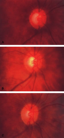 *The higher on the list, the more likely the sign is diagnostic of glaucomatous damage. Every sign can be valuable, especially when combined with other listed changes or other findings of glaucoma. The order of listing is relative and will vary with the type of glaucoma and the patient. For example, concentric thinning of the rim is typical of glaucoma associated with high intraocular pressures such as juvenile-onset open-angle glaucoma, but rare in glaucomas seen in association with average intraocular pressures; in contrast, focal notches are common in the glaucomas associated with low intraocular pressures but rare in those with marked elevation of pressure. †“Notch” is defined as a sudden deviation from the circular shape of the cup. The extent of the deviation must be 0.1 rim/disk ratio width or greater. The notch need not reach all the way to the edge of the rim but may reach all the way to the edge of the rim. The circumferential extent of the notch must be less than three clock hours.