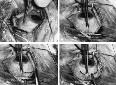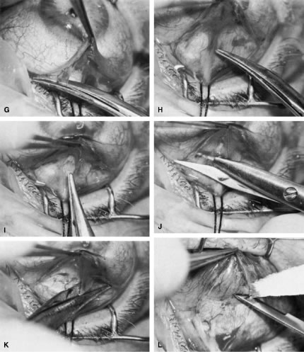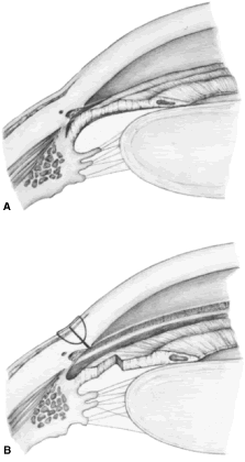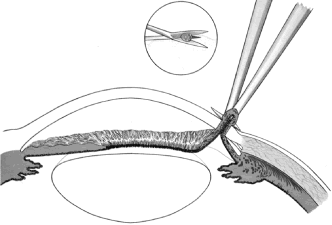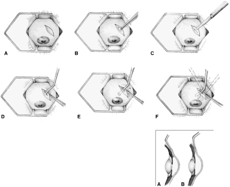 Once the anterior chamber is maintaining a well-formed condition, long-acting cycloplegic agents, such as atropine, can be discontinued. As soon as the intraocular inflammation begins to resolve, the topical steroids can be tapered, and, in most cases, they should be discontinued within 3 weeks of surgery. Longer usage predisposes patients to cataract and steroid-induced glaucoma. Systemic steroids are used by some surgeons, and they may increase the success rate arid tend to produce an eye with a thin, polycystic bleb and a low final IOP. The complications of systemic steroids, however, are significant, and must be taken into account. One of the most helpful maneuvers after a guarded filtration procedure is the CTM,58 which is shown in Figure 16. This technique of applying pressure in a localized fashion directly over the radial edge of the scleral flap is appropriate for guarded filtration procedures that are performed so that the scleral flap overlies a small edge of underlying cornea and sclera. Localized pressure at the radial edge of the flap deforms the edge, disrupting the union between the overlying scleral flap and the underlying corneosclera. Thus, gentle pressure will encourage aqueous to flow through the radial edge of the scleral flap unlike the technique that has been used for generations to encourage aqueous to flow out of a sclerostomy.54 This technique involves pressing oh the globe, which increases the IOP and causes the underlying sclera and cornea to be pushed up against the overlying scleral flap, making the apposition between these two tissues even tighter. Thus, this technique does not work well in patients who have had a guarded filtration procedure and may be more likely to force iris into the internal ostomy opening. The CTM is performed by anesthetizing the eye well with several instillations of proparacaine 0.5%.58 A sterile, cotton-tipped applicator is soaked with the anesthetic agent. With the patient observed at the slit lamp, the upper lid is lifted, the patient is asked to look down, and gentle pressure is applied with the tip of the applicator directly over one of the radial grooves of the scleral flap. This maneuver should be associated with immediate shallowing of the anterior chamber, development of a high bleb, and fall of IOP. If these changes do not occur immediately, the applicator is placed over the other radial incision, and pressure applied. It may be necessary to try several locations until the spot is found where pressure will cause deformation of the incision arid result in encouraging filtration. The CTM should be done gently. In our hands, it has not been associated with complications. It may be repeated three or four times daily for the first 3 or 4 days to encourage the development of a patent fistula. After 2 weeks or so, it probably will not have a permanent effect on the outcome of surgery. We often use the CTM in the early postoperative period. However, we do not believe in long-term continued use of massage or pressure of any kind. In our opinion, this pressure is traumatizing to the eye and rarely results in an improvement in the long-term result. When CTM does not re-establish satisfactory filtration or when the IOP remains higher than the surgeon has hoped and filtration is inadequate, it often is helpful to release one of the 10-0 nylon sutures in the scleral flap by burning the suture transconjunctivally with an argon laser. A small lens is used to flatten the conjunctiva. We use the lens designed by Hoskins.54 The edge of the Zeiss four-mirror lens also may be used. The Hoskins lens compresses the conjunctiva, making a suture in the sclera easily visible. The suture can be burned with a spot size of 50 μm, an exposure time of 0.1 second, and a power of 300 to 700 mW, using the blue or green light of the argon laser. Depending on the laser and the surgeon's technique, more or less power may be necessary. In most cases, one or two applications with a laser will burn through the suture, allowing it to retract and releasing traction on the incision. In many instances, a bleb develops immediately, and IOP falls. Several sutures may need to be released to obtain adequate filtration. As mentioned earlier, when the surgeon plans to release sutures with a laser, a 10-0 nylon suture can be placed in the middle of the posterior edge of the flap so that there is no excessive filtration when sutures are released. In the presence of subconjunctival blood, there is a significant risk of conjunctival burns or holes. Use of the red krypton laser reduces absorption by blood and increases the success of suture lysis in the presence of subconjunctival blood. The management of complications is covered in the third section of this chapter. TRABECULOTOMY Trabeculotomy is useful for managing congenital glaucoma where Schlemm's canal can be identified. Although goniotomy is the procedure of choice in infants or children with congenital glaucoma in whom the cornea is sufficiently clear to allow the surgeon to see into the anterior chamber angle, trabeculotomy is a satisfactory second choice, and it is the preferred procedure where the cornea is hazy. It is of value in the secondary glaucomas as well, especially the open-angle inflammatory glaucomas, such as those seen in association with Still's disease. The procedure demands high magnification; it is best done with an operating microscope. The initial portion of the operation is virtually identical to a guarded filtration procedure (Fig. 17; see also Fig. 15). A fornix-based or limbus-based conjunctival flap is developed at the 12 o'clock position. A scleral flap approximately 4 × 4 mm is fashioned, hinged at the limbus (see Fig. 13A). This flap, however, differs from a guarded filtration procedure flap in that it should be thicker; whereas a trabeculotomy flap ordinarily is one third to one fourth the thickness of the sclera, when performing a trabeculotomy, the scleral flap should be two thirds t