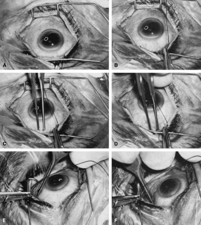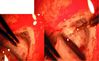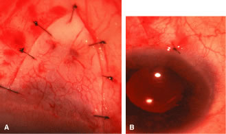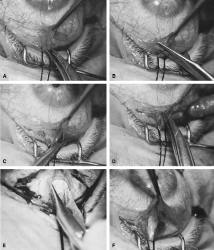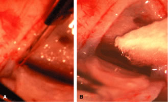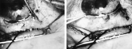 In the postoperative period, a diagnosis of suprachoroidal expulsive hemorrhage can be made simply on the basis of the history provided by the patient. The typical history is the sudden onset of excruciating pain, often following coughing, sneezing, straining at stool, or some other activity that increases the venous pressure. Postoperatively the eyes that are most predisposed are those that have had a significant elevation of IOP for a long period and then become hypotonous. Bleeding into the suprachoroidal space at the time of surgery, or later, characteristically produces a partially or totally flat anterior chamber and usually severe pain. The IOP will vary depending on the amount of residual aqueous filtration and the extent of the hemorrhage; it can range from low (5 mm Hg) to high (50 mm Hg). Suprachoroidal hemorrhage can occur at the time of surgery or spontaneously after surgery. At the time of surgery, it is recognized by the sudden development of positive pressure with extrusion of intraocular contents, the appearance of a dark swelling in the fundus of the eye, and a rapidly enlarging choroidal detachment. The immediate management of suprachoroidal hemorrhage involves first closing the eye. Intravenous acetazolamide and/or mannitol are given to try to lower the IOP. Additional sutures are placed in the incision to make a watertight closure. Attention is then directed towards returning the eye to as healthy a condition as possible. This will take time and is assisted by the IOP-lowering effect of the acetazolamide and the mannitol. A viscoelastic is injected into the anterior chamber, the iris is reposited, and vitreous is meticulously removed from the incision. It is best not to attempt a large vitrectomy, and it is best not to drain the suprachoroidal hemorrhage. The goal is to ensure the closure of the eye and meticulous closure of the incision. Postoperatively, the patient is managed with cycloplegics, steroids, and antihypertensive agents to maintain the IOP in a satisfactory range. The IOP will usually fall spontaneously within several days. It is best to avoid draining the suprachoroidal fluid if possible. However, if pain is excruciating and unremitting or the suprachoroidal hemorrhage so extensive that the retinal surfaces are touching (“kissing choroidals”), then drainage of the hemorrhage is appropriate. If possible, it is preferable to wait until the fourth postoperative day, by which time the clot will have lysed and draining the hemorrhage is facilitated. The technique of drainage is essentially as the same as for a choroidal detachment, although the incision into the sclera may need to be larger. It is important to resist the temptation to try to grasp the clot and pull it out. It is not possible to distinguish between the clot and the choroid. If bleeding has occurred into the vitreous, meticulous vitrectomy with removal of the vitreous and the intravitreal blood is nearly always required to prevent a later retinal detachment. Bleeding Into the Anterior Chamber Bleeding into the anterior chamber is common, especially when the IOP is lower than the pressure in the episcleral veins. Thus, until the IOP rises to approximately 12 mm Hg, it is not unusual to see a hyphema. Only rarely does this hyphema require drainage. If more than 50% of the chamber is filled with blood, it usually is necessary to wash it out. It is important to keep the blood from the area of filtration so that it does not predispose the patient to loss of a functioning fistula. Thus, the patient should be instructed to maintain a posture that will keep the blood out of the fistula. If the pressure rises and remains in the anterior chamber, the situation becomes more serious. Blood staining can result. Drainage of the blood and revision of the guarded filtration procedure may be needed in these cases. Bleb Infection Approximately 1% of thin, polycystic blebs become infected. The bacteria can pass into the anterior chamber and cause endophthalmitis. This type of infection usually responds well to treatment. However, in some cases, especially where there is a connection between the bleb and the vitreous, the rate of progression of the infection can be fulminating, and the eye can be lost rapidly. The general principles of treating endophthalmitis largely apply, with the important exception that if the infection is limited to the bleb (with a clear vitreous), a vitreous tap and placement of intravitreous antibiotics are not necessary and are not recommended. If it is clear that the infection is limited to the bleb itself, with a minimal anterior chamber reaction, no hypopyon, and no involvement of the vitreous, treatment with topical antibiotics is usually adequate. Agents must be chosen that will cover the full range of organisms. Fortified gentamicin and a cephalosporin make a good combination, alternating the drops every hour. The patient must be meticulously monitored, and if there is increasing pain, decreasing vision, or other signs of increasing infection, then the patient must be treated as if he or she has a full-fledged endophthalmitis. One of the complications of a blebitis is a failure of the bleb. Consequently, as soon as it is clear that the infection is responding to the antibiotics, institution of topical corticosteroids is usually appropriate. Prednisolone 1% four times daily is a satisfactory choice. The IOP must be followed carefully because the bleb may fail and the pressure may rise suddenly and destructively. Infections of the bleb and endophthalmitis are increasingly important concerns since the addition of the adjunctive use of antimetabolites at the time of filtration surgery. When filtration procedures are performed inferiorly, the incidence of endophthalmitis has been reported to be 8%.35,41,42 When procedures are performed superiorly with antimetabolites, the type of blebs that develop typically are predisposed to developing endophthalmitis. Tears in the Conjunctival 
