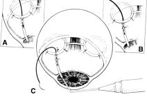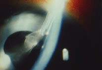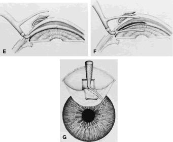 After the iridectomy is complete, the iris usually will return spontaneously into the anterior chamber unless it has suffered damage as a result of high pressure (as occurs in severe attacks of angle closure glaucoma). In patients with a reactive sphincter, it usually is necessary only to release the iris from the grasp of the incision. The iris can be stroked into position with the use of a blunt instrument on the corneal surface. Attempting to reposit the iris by directing a stream of irrigating solution into the incision is not recommended; the solution may enter the posterior chamber, forcing even more iris out of the incision. If the surgeon has difficulty restoring the iris to its proper position, injection through the previously placed paracentesis track of freshly mixed acetylcholine usually will solve the problem. In the eye with a dilated fixed pupil and a flaccid iris, it often is preferable to perform a sector iridectomy. Once the pupil is entirely round, the suture placed previously in the corneoscleral incision can be pulled up and secured promptly. Injecting balanced salt or acetylcholine solution through the previously placed paracentesis can deepen the chamber. In patients who have had recent angle-closure attacks and in whom peripheral anterior synechiae may be newly developed, forceful deepening of the anterior chamber at this point may tear open the synechiae and restore normal function of the anterior chamber. The procedure of chamber deepening must be done cautiously, with careful monitoring of IOP. A gonioprism, such as the Zeiss four-mirror lens, can be used with an operating microscope to monitor the effect on anterior chamber angle. At the close of the procedure, the pupil should be round, the chamber deep, and the incision sufficiently closed that there is no leakage. The IOP should be approximately 15 to 30 mm Hg, being raised to that level by injection through the keratostomy. Such a pressure may help prevent subsequent choroidal detachment and allows the integrity of the incision to be tested. If the corneoscleral incision has been properly placed and sutured, there should be minimal transient astigmatism. Vision should return to the preoperative level within several days. If the eye is inflamed, it usually is helpful to instill a short-acting cycloplegic agent such as cyclopentolate. Furthermore, the surgeon may give a subconjunctival injection of corticosteroid, although it rarely is necessary to do so. An antibiotic ointment and a light patch usually are applied until the facial nerve block has worn off. If there is a reasonable chance that the patient will need a filtration procedure at a later date, then the surgical procedure is modified to perform the iridectomy through clear cornea, rather than under a fornix-based flap. The technique is almost exactly the same, with the obvious exception that the incision is placed through clear cornea. Postoperative Care In almost all instances, iridectomy can be performed as an outpatient procedure. However, when associated with severe pain or when the attack of angle closure has been difficult to stop and has required extensive usage of carbonic anhydrase inhibitors and osmotic agents, admission of the patient to the hospital may be justified. Especially in older and infirm patients, the general state of health must be monitored carefully. It is important to verify that the patient has not become overly dehydrated or experienced an attack of congestive failure. The eye patch usually is removed from the treated eye as soon as the facial nerve block has worn off. If the procedure is done on an outpatient basis, a patch and shield may be left in place until the patient returns the next day for the first postoperative visit. A drop containing a corticosteroid can be used topically three or four times a day until the inflammatory response has disappeared, usually 4 to 7 days. Careful attention must be paid to the state of the pupil. The development of posterior synechiae is an important and usually unnecessary complication. Although it is not clear that posterior synechiae predispose the patient to the development of cataract, the presence of such adhesions makes extracapsular cataract extraction more difficult. Because many patients with angle-closure glaucoma will later have cataract extraction, the development of such adhesions may jeopardize the long-term visual result. Furthermore, inability of the pupil to dilate in the dark may limit the patient's visual function, especially in conjunction with a developing cataract. In most cases, dilating drops are used routinely until the inflammatory response has worn off. One acceptable program is to use tropicamide 1% at sufficient intervals to ensure that the pupil is dilated adequately for a period of approximately 1 week. The medication can be continued at bedtime for 2 to 3 weeks, or even longer, until it is certain that the inflammatory response has disappeared. Many patients are given pilocarpine preoperatively. There is a tendency to continue the administration of pilocarpine postoperatively, especially when control of IOP has been difficult. This practice should be discouraged. Pilocarpine will predispose patients to posterior synechiae and should be avoided if possible. The drug of choice for pressure control usually is topical epinephrine, a β-blocker, or epinephrine plus a β-blocker. If these two agents are not adequate, a carbonic anhydrase inhibitor can be used until the eye is entirely quiet, at which time pilocarpine can be reinstituted. In such cases, however, care should be taken to dilate the pupil periodically to prevent the development of posterior synechiae. Some surgeons may be reluctant to use dilating drops for fear of inducing angle closure. This possibility exists, but it is uncommon. Furthermore, it is preferable to know immediately whether the iridectomy has eliminated the possibility of angle closure caused by papillary dilatation. Therefore