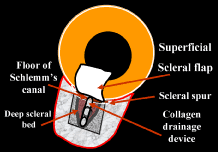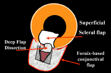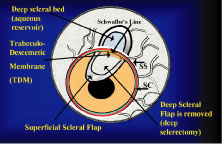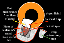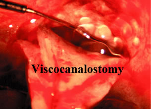 Patients at high risk for suprachoroidal hemorrhage are still at risk with NPFS because of the need for substantial intraoperative anterior chamber decompression. The postoperative risk of delayed suprachoroidal hemorrhage is minimized by the double guarded technique. DEEP SCLERECTOMY WITH VISCOCANALOSTOMY DSVC is a systematic layer-by-layer dismantling of a defective outflow system. At the heart of DSVC is the precise fashioning of an intact subscleral cavern that ultimately functions as a relay station for the passage of aqueous. Aqueous bypasses the blocked trabecular meshwork by entering the cavern through an adjacent gossamer quality Descemet's window111 and exiting the cavern through Schlemm's canal, by uveoscleral channels, or by transscleral flow. Bleb formation is avoided because aqueous accumulates inside the sclera instead of underneath the conjunctiva, a long-term advantage from a dysesthesia and infectious viewpoint. The surgical technique is unforgiving and the learning curve steep. Surgeons with prior trabeculotomy skills112 will find this procedure easier but still demanding. I would not recommend topical anesthesia for one's first case. Informed consent should reflect the investigational nature of these procedures and a 20-point preoperative checklist113 is helpful in planning filtration surgery. Familiar instruments should be used for scleral flap dissection, and a special cannula is necessary to intubate Schlemm's canal.