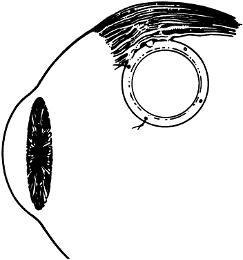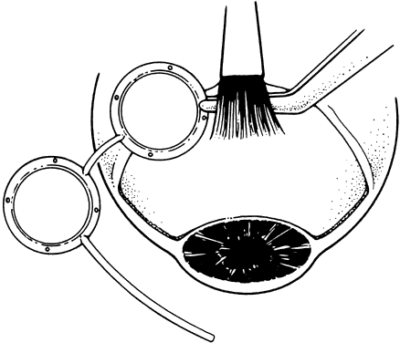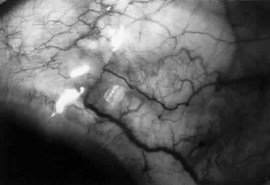 PRIMING THE VALVE. By forceful irrigation through the tube, the two silicone leaflets that make up the valve are separated. A stream of fluid should be seen entering the plate zone from the valve region. If this maneuver is neglected, there may be no flow in vivo and intraocular may become elevated postoperatively and require reoperation. SHUNT POSITION. The reservoir plate fits between the rectus muscles and should be sutured into position with the anterior reservoir edge about 8 mm from the limbus. There should be no override of either the superior or lateral rectus muscle. Placement of the shunt in the superonasal position, especially in short eyes, may come perilously close to the optic nerve. The long anterior posterior dimension of the shunt makes it a less-than-attractive shunt placement in the superonasal region. |